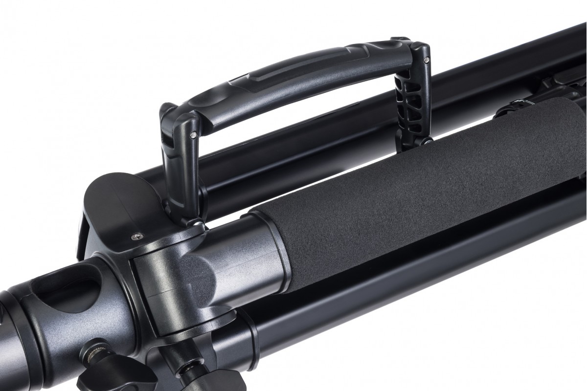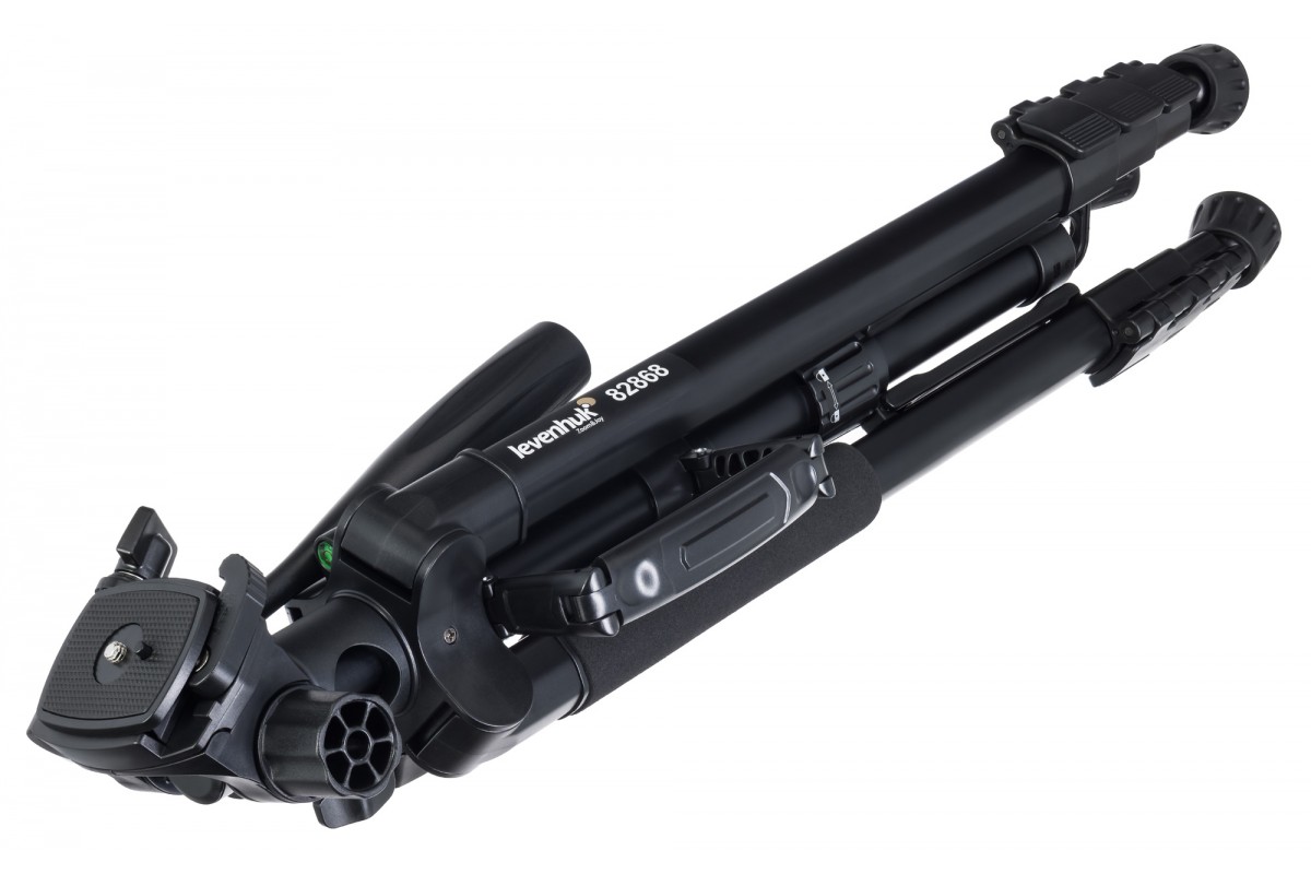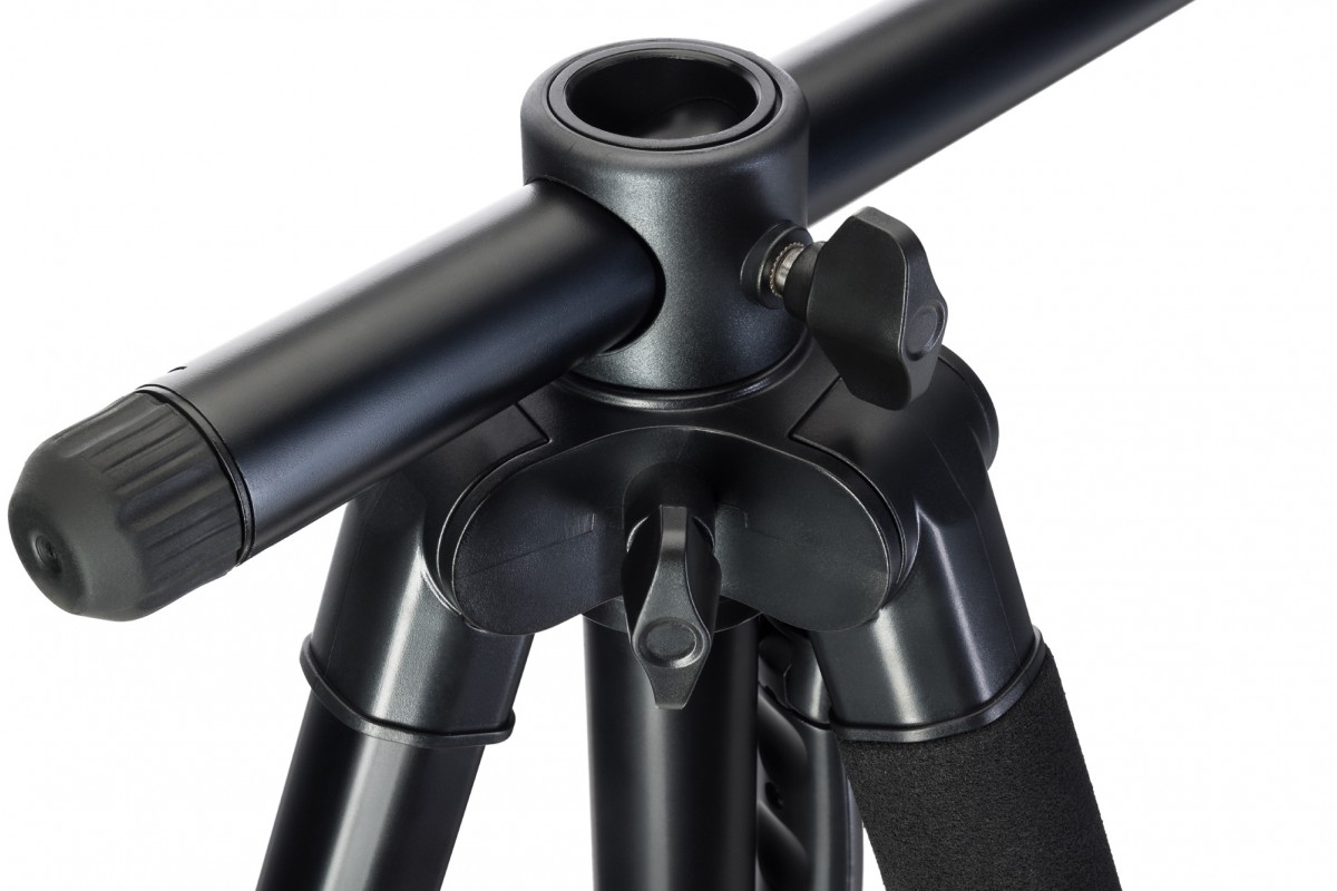 Штатив регулируется по высоте с помощью изменения длины ножек или вертикального движения центрального сегмента. В выбранном положении ножки надежно закрепляются с помощью флип-замков, а так как они обрезинены, штатив не будет скользить даже по гладкому полу, обеспечивая конструкции полную устойчивость. Для дополнительной стабилизации предусмотрен крюк для утяжелителя. Пузырьковый уровень позволит проконтролировать, насколько ровно штатив установлен.