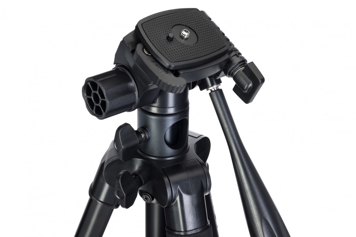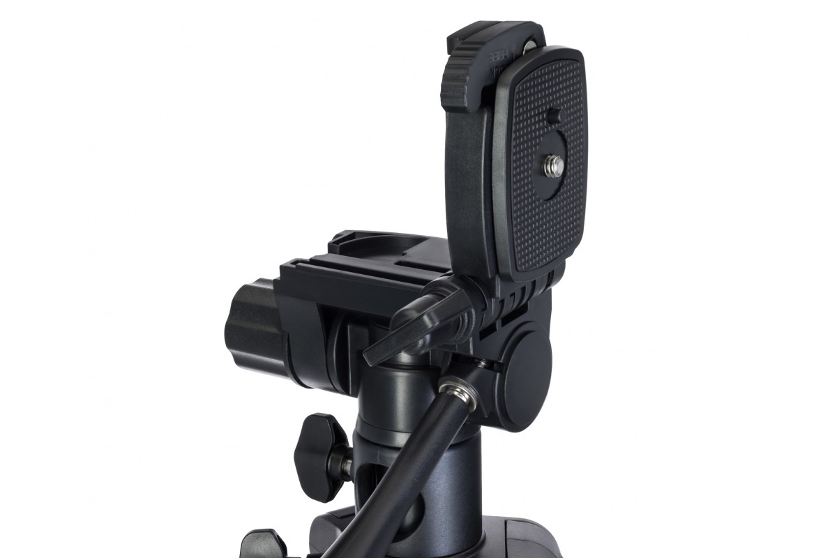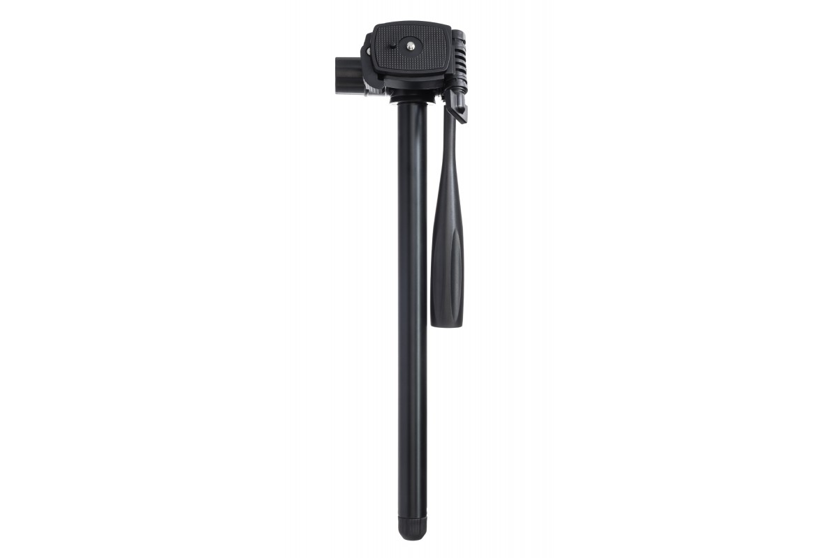 Быстросъемная площадка значительно облегчает процесс смены и фиксации оборудования. Благодаря вращающейся и наклоняемой пластиковой головке и фиксатору, откидывающемуся вбок до 90°, пользователь сможет установить прибор под идеальным для его задач углом. Интересная особенность этой модели состоит в том, что центральный сегмент опоры можно использовать как самостоятельный монопод или горизонтальный держатель для съемки сверху вниз.