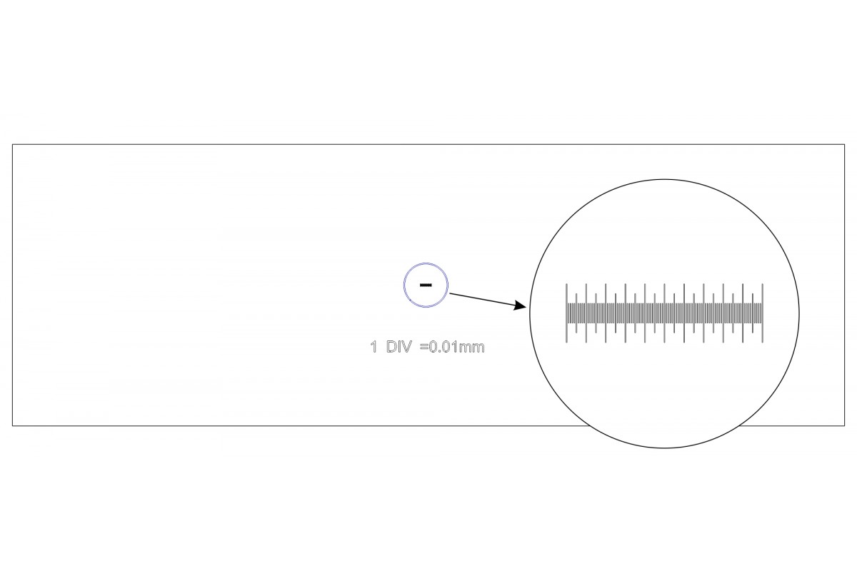 Калибровочный слайд MAGUS CS1 (0,01) – это прозрачное стекло стандартного размера с нанесенной на него горизонтальной микрометрической шкалой. Шкала имеет 100 делений, цена деления составляет 0,01 мм.