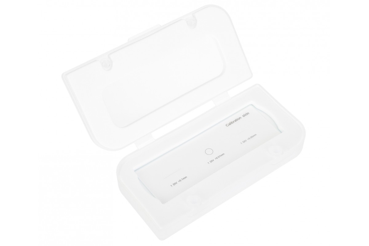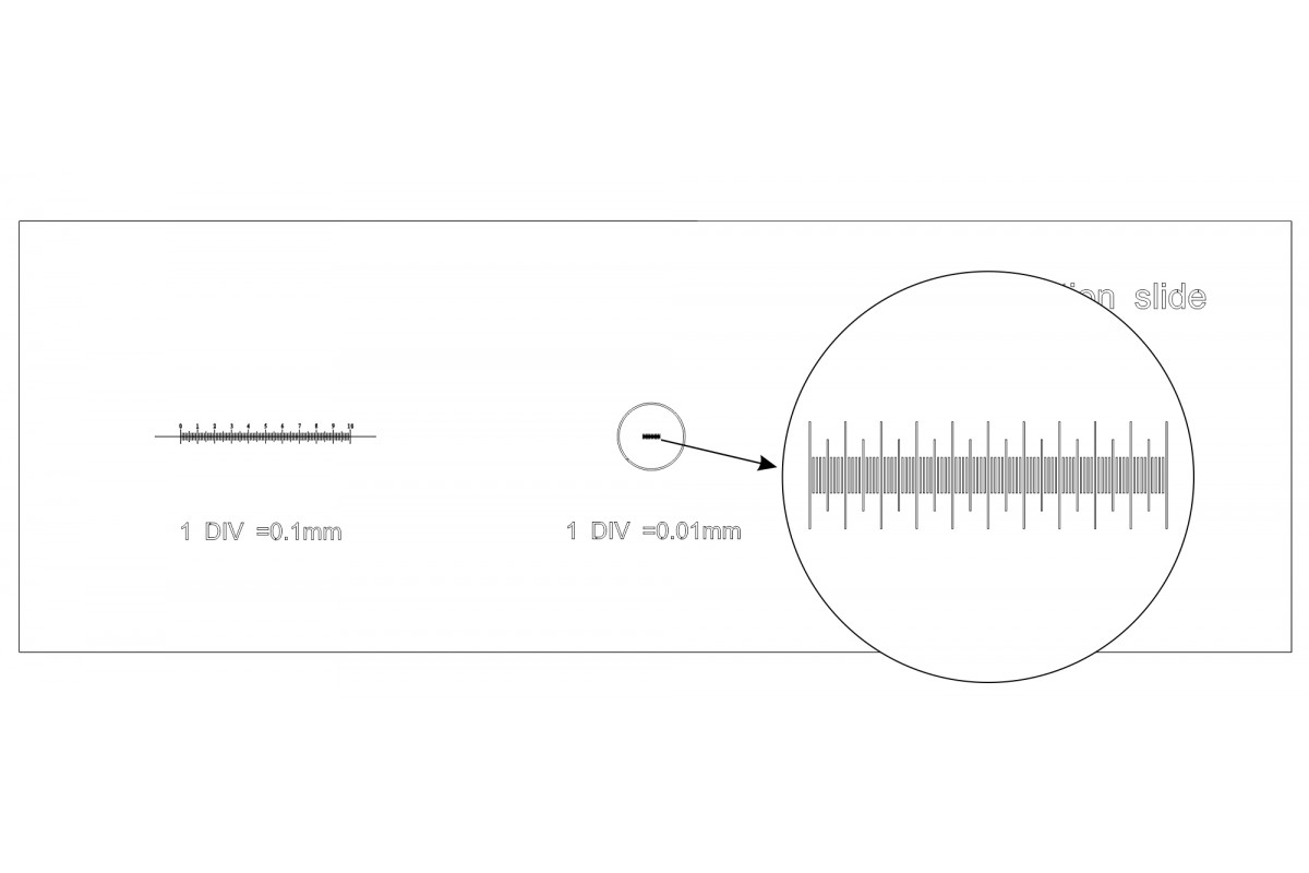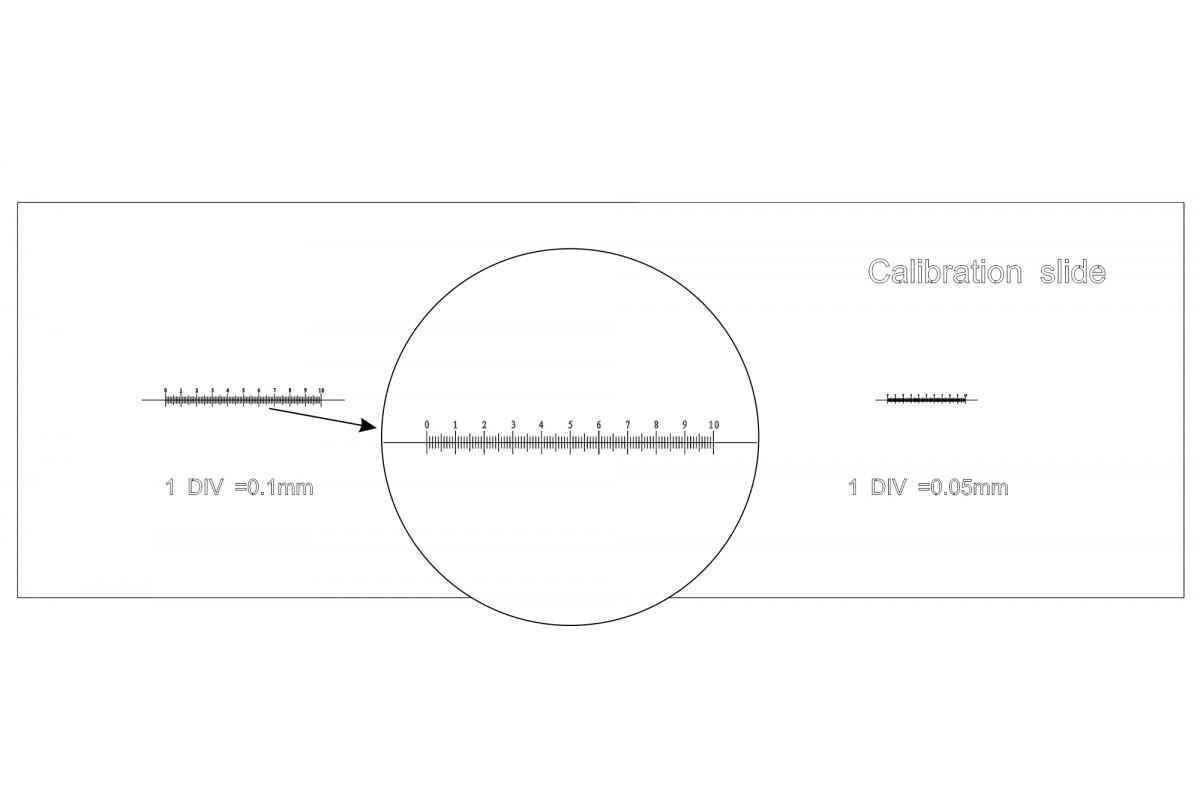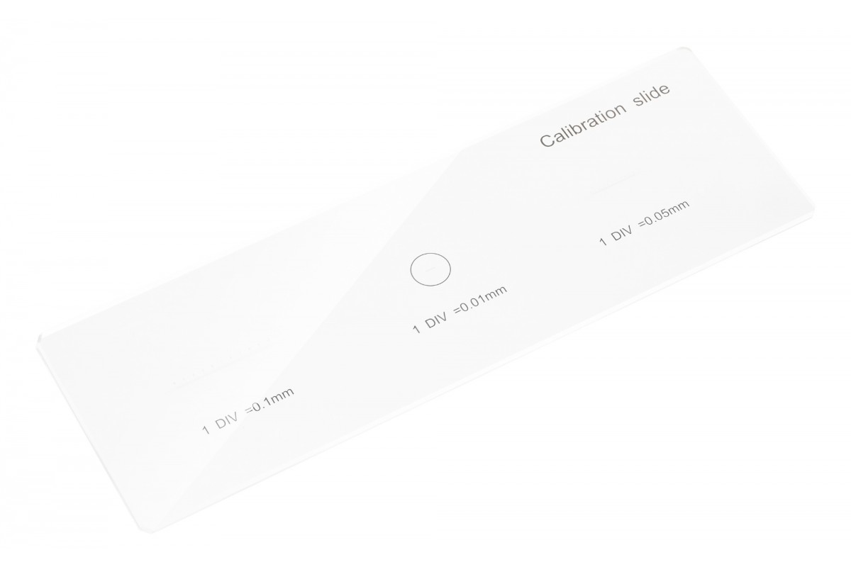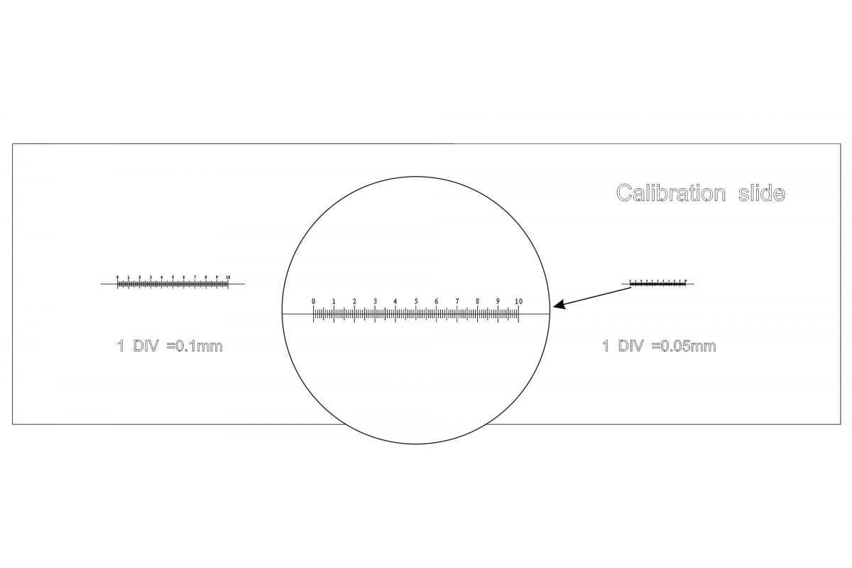 Калибровочный (микрометрический) слайд нужен для внесения корректировок в программу анализа изображений – с его помощью определяется поправочный коэффициент, который позволяет повысить точность измерений. Также калибровочный слайд может быть использован для калибровки окулярной шкалы.