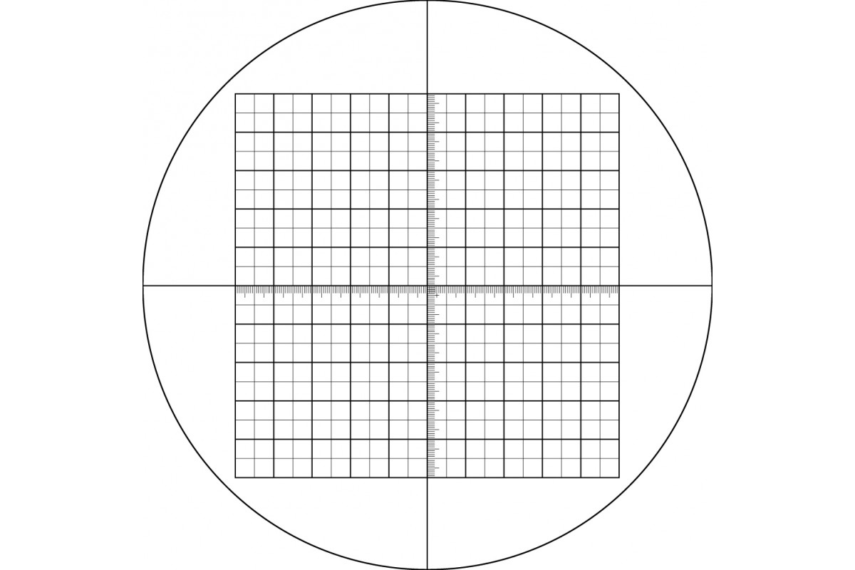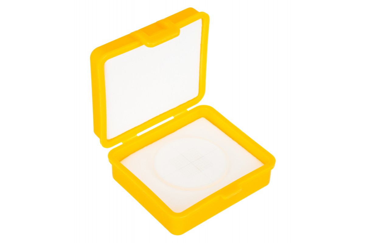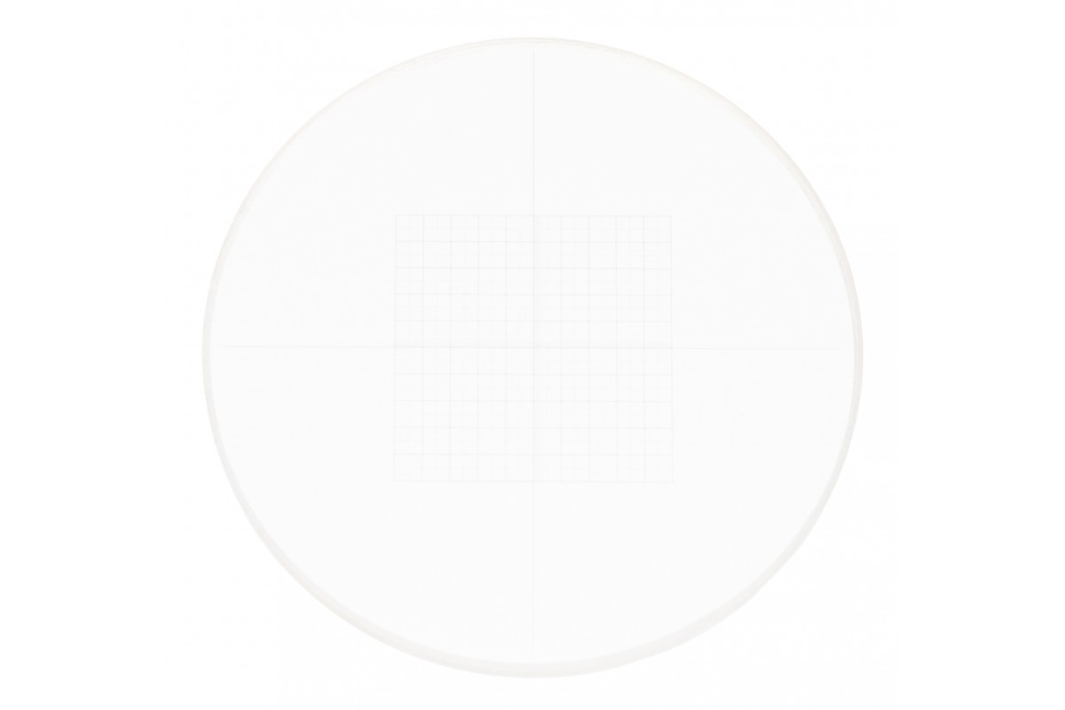 Калибровочный слайд MAGUS CSS2 для стереомикроскопов представляет собой пластину из оптического стекла диаметром 24 мм. На слайд нанесены перекрестие с микрометрическими шкалами по осям X и Y с ценой деления 0,05 мм и измерительная сетка 10х10 мм. В одном ряду сетки расположено 20 ячеек размером 0,5х0,5 мм.