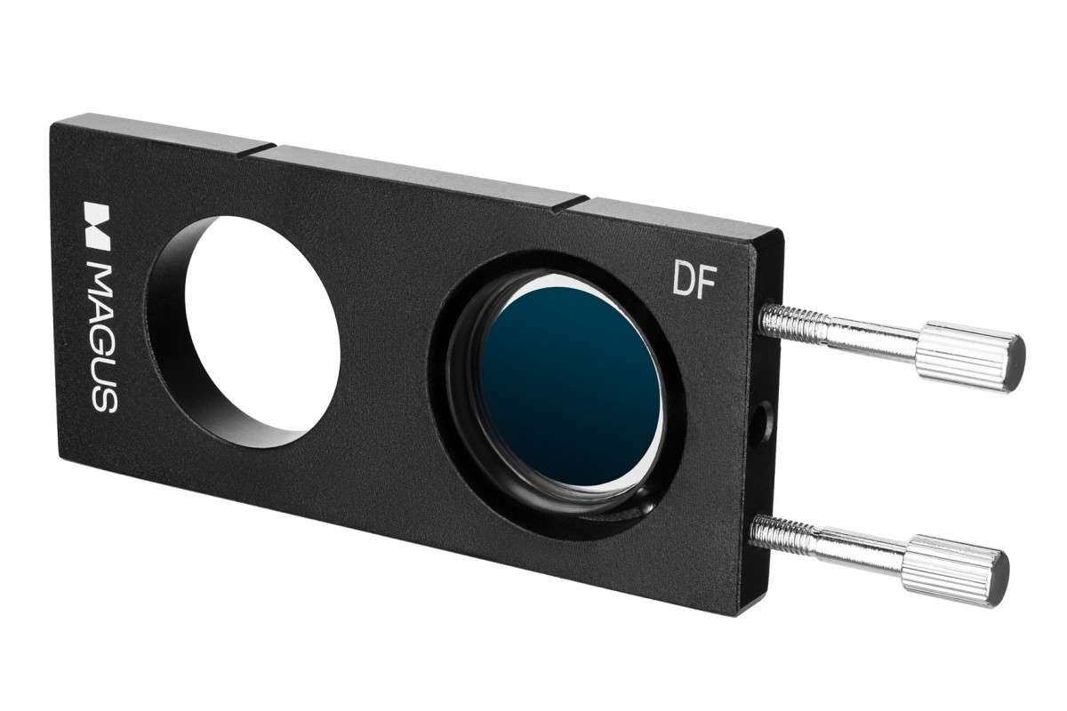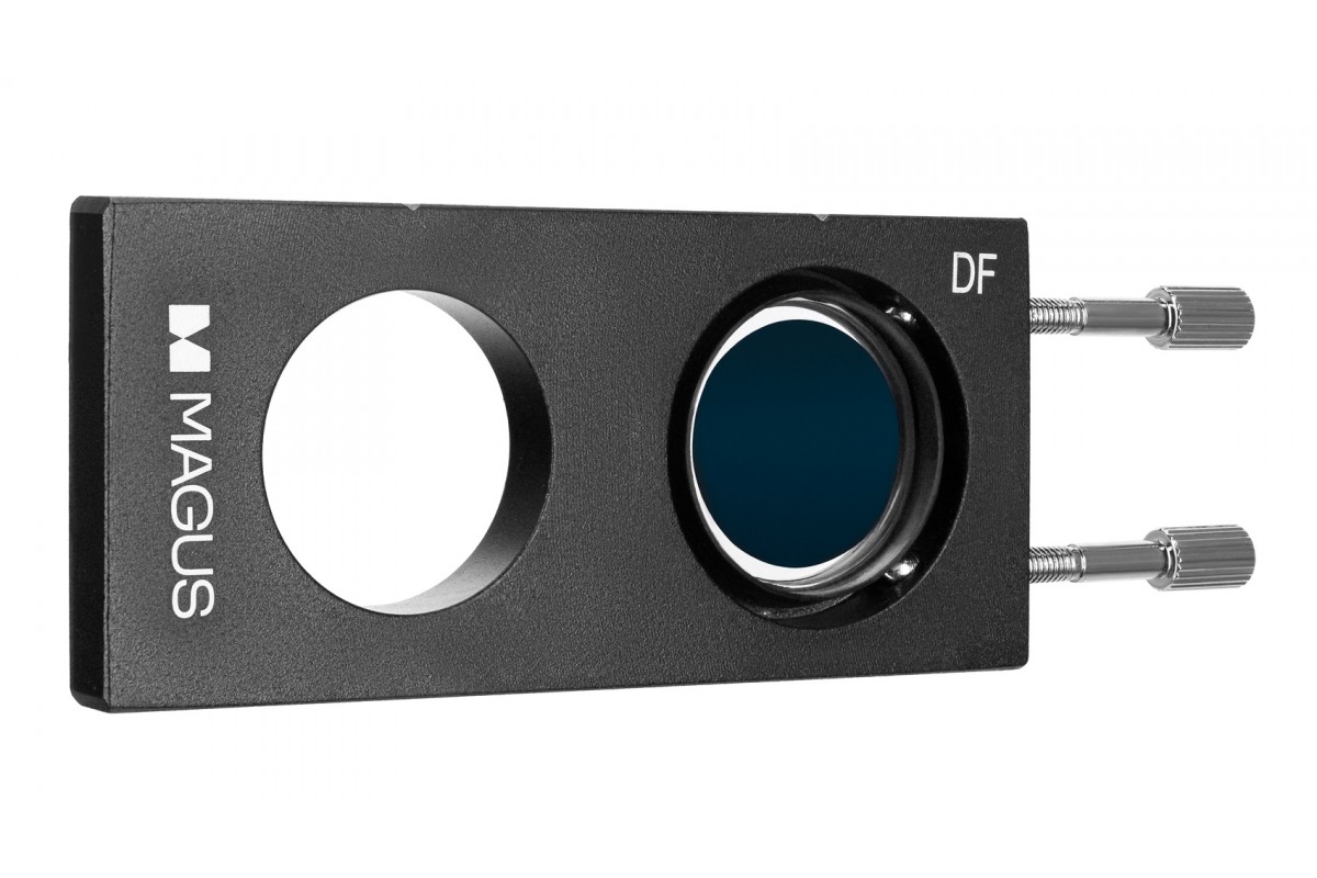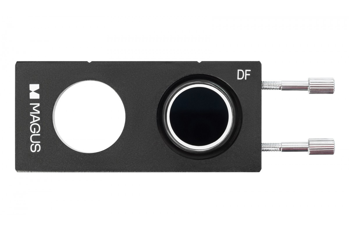 Слайдер для исследований прозрачных объектов методом темного поля, без их окрашивания. Представляет собой вставку в конденсор Аббе. Кроме встроенной диафрагмы слайдер имеет свободное отверстие для быстрого переключения на метод светлого поля. Слайдер MAGUS DFS1 – удобная замена обычному темнопольному конденсору, для установки которого надо снимать с микроскопа конденсор Аббе.