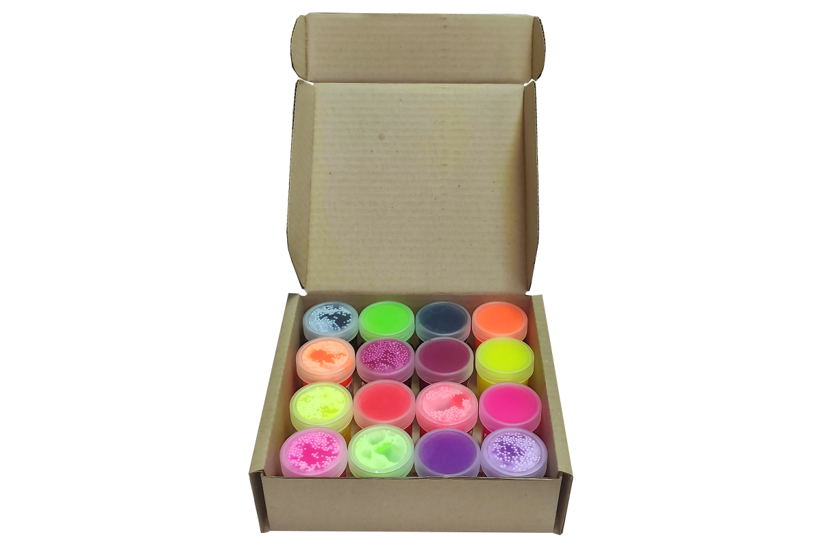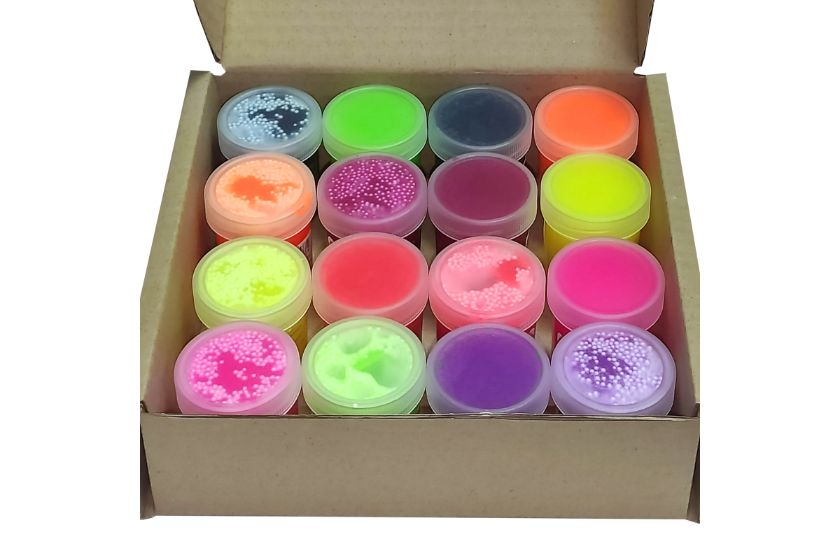 В наборе 16 баночек в виде туб со слаймами по 40 гр разных цветов.