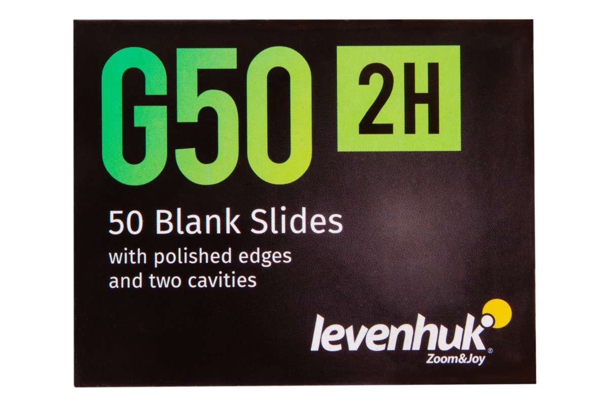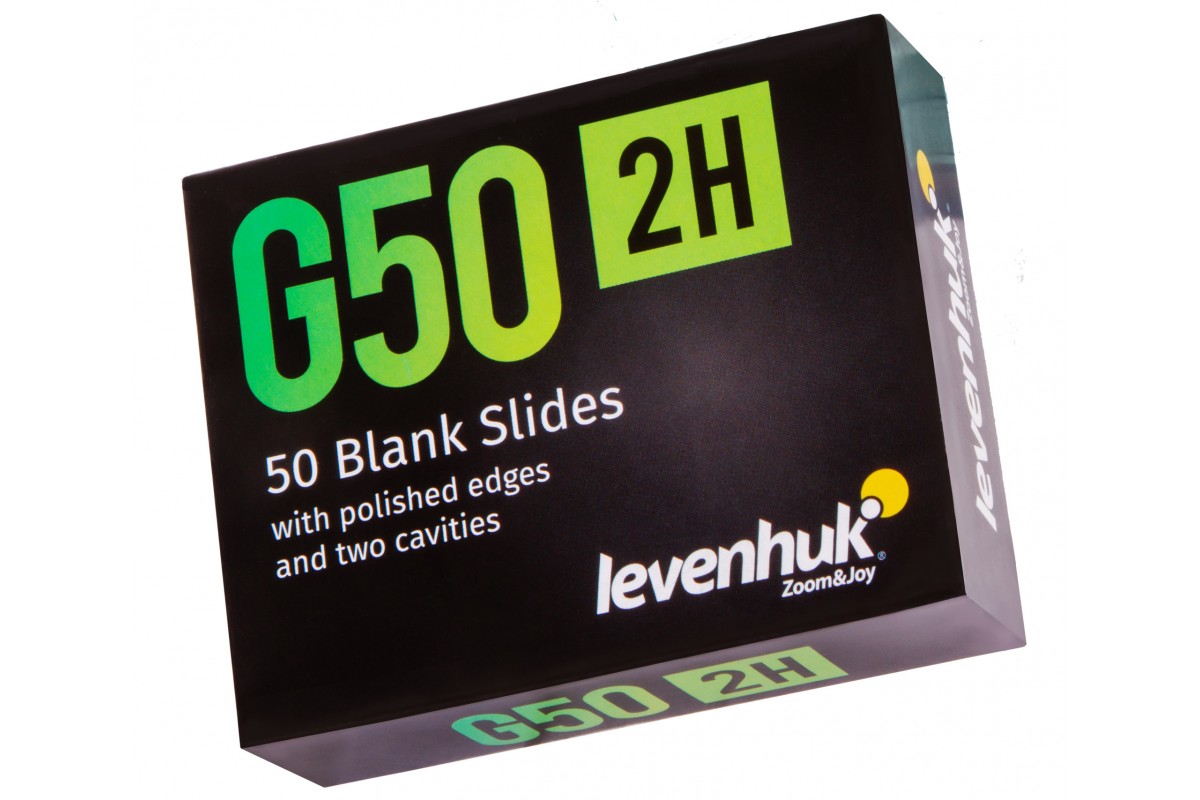 Levenhuk G50 2H – предметные стекла, созданные для работы с препаратами «висячая капля». В набор входят 50 стекол с двумя лунками, в каждую из которых можно поместить один микропрепарат. Стекла прозрачны, в них нет мутных примесей, их толщина одинакова по всей длине.