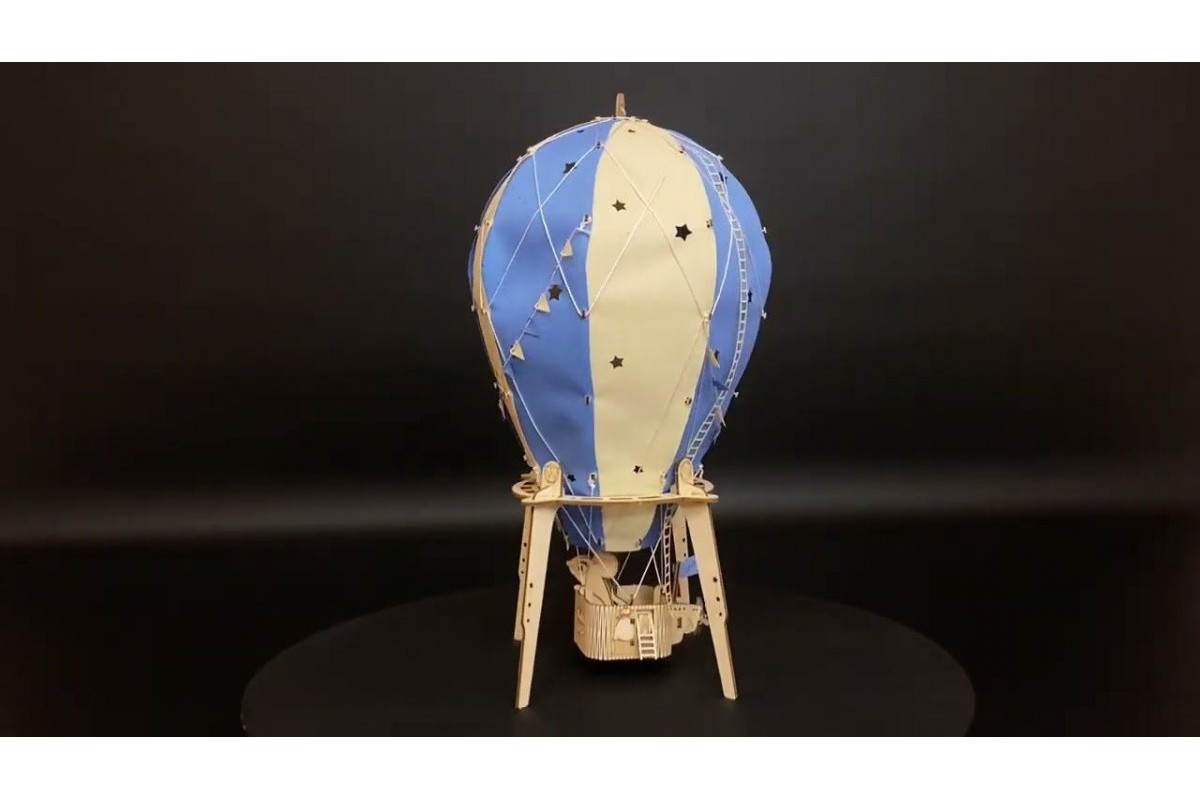 Светильник-ночник выполнен в виде воздушного шара, который можно использовать как подвесной ночник или поставить на подставку. Баллон воздушного шара состоит из ткани двух цветов и обвязан канатной нитью, а корзина оснащена вращающимся винтом.