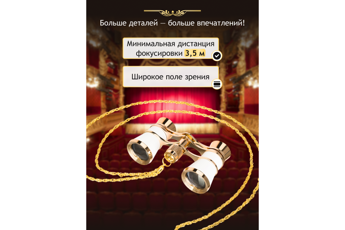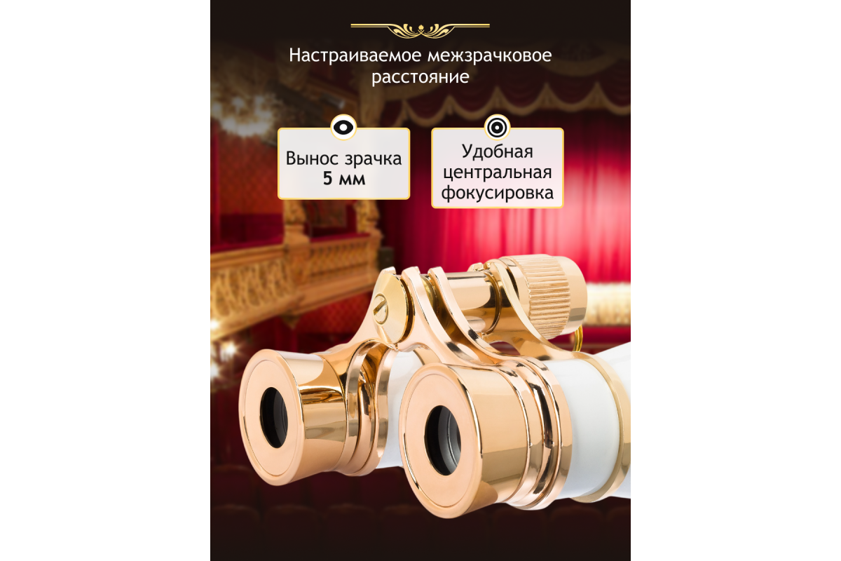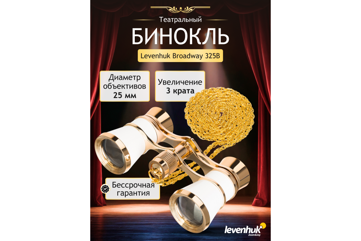 Компактный театральный бинокль в изящном корпусе Levenhuk Broadway 325B станет не только полезным оптическим помощником, но и стильным аксессуаром. Он обеспечивает 3-кратное приближение, имеет сравнительно широкое поле зрения и малую дистанцию ближней фокусировки (3,5 метра). Все это позволяет не упустить ни одной детали происходящего на сцене. Белый металлический корпус украшен золотыми деталями – такой прибор точно не останется без внимания.