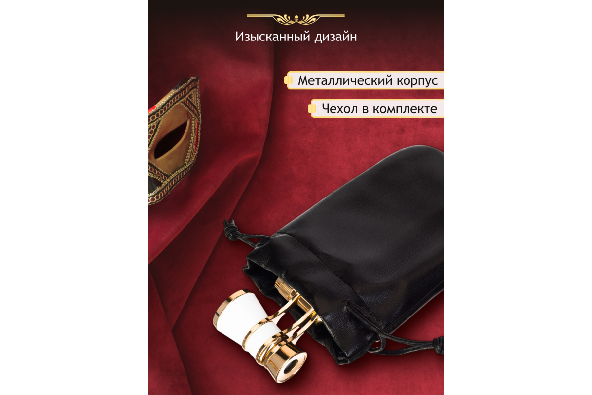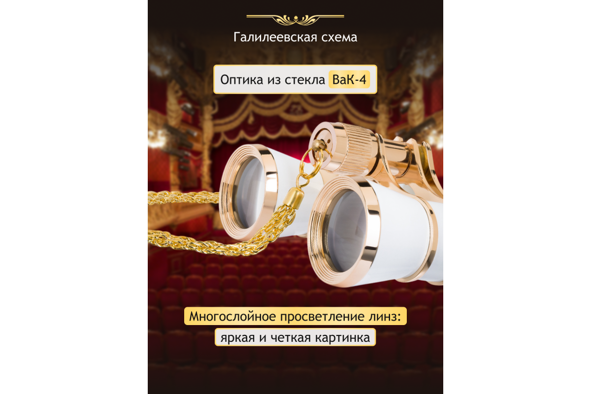 Оптика бинокля собрана по схеме Галилея, линзы изготовлены из высококачественного стекла BaK-4. Получить ясную и детализированную картинку даже в помещении с тусклым освещением позволяет полное многослойное просветление оптических элементов. Фокусировка производится поворотом миниатюрного центрального барабана, изображение станет резким в обоих окулярах одновременно. Возможность регулировки межзрачкового расстояния обеспечивает комфорт наблюдений.