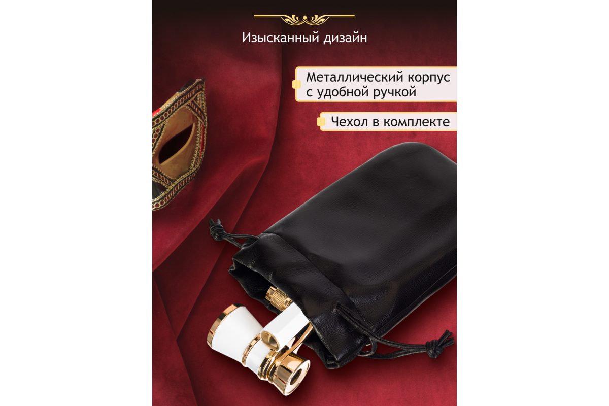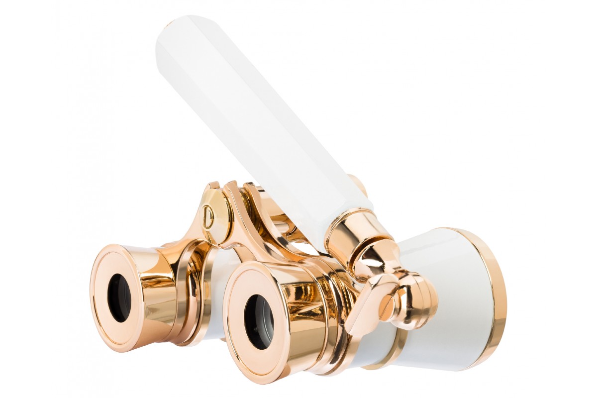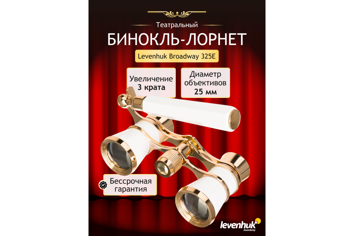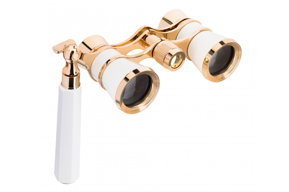 Бинокль-лорнет Levenhuk Broadway 325E – элегантная модель, созданная специально для тех, кто любит театр. Оптический инструмент выполнен в миниатюрном металлическом корпусе и дополнен специальной складной ручкой. Компактный размер делает бинокль незаменимым для посещения разных мероприятий – прибор поместится даже в дамскую сумочку. А благодаря стильному белому корпусу с золотыми деталями эта модель станет украшением вашего вечернего образа.