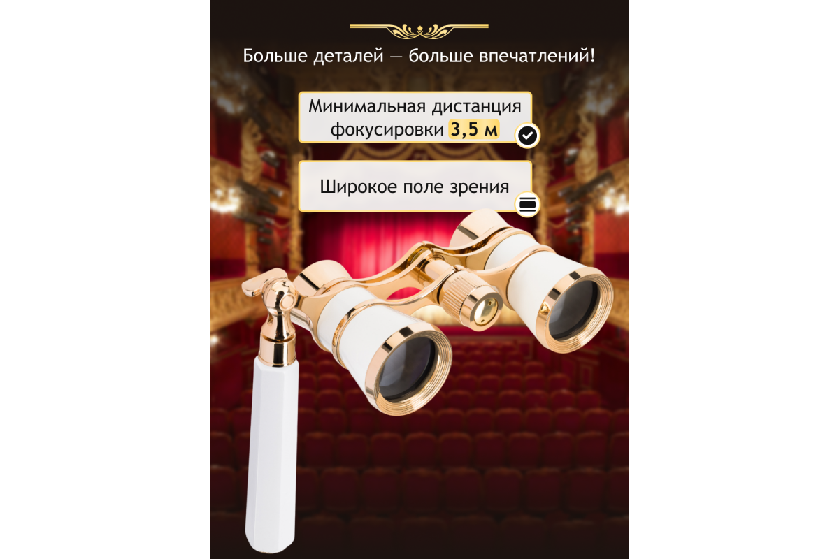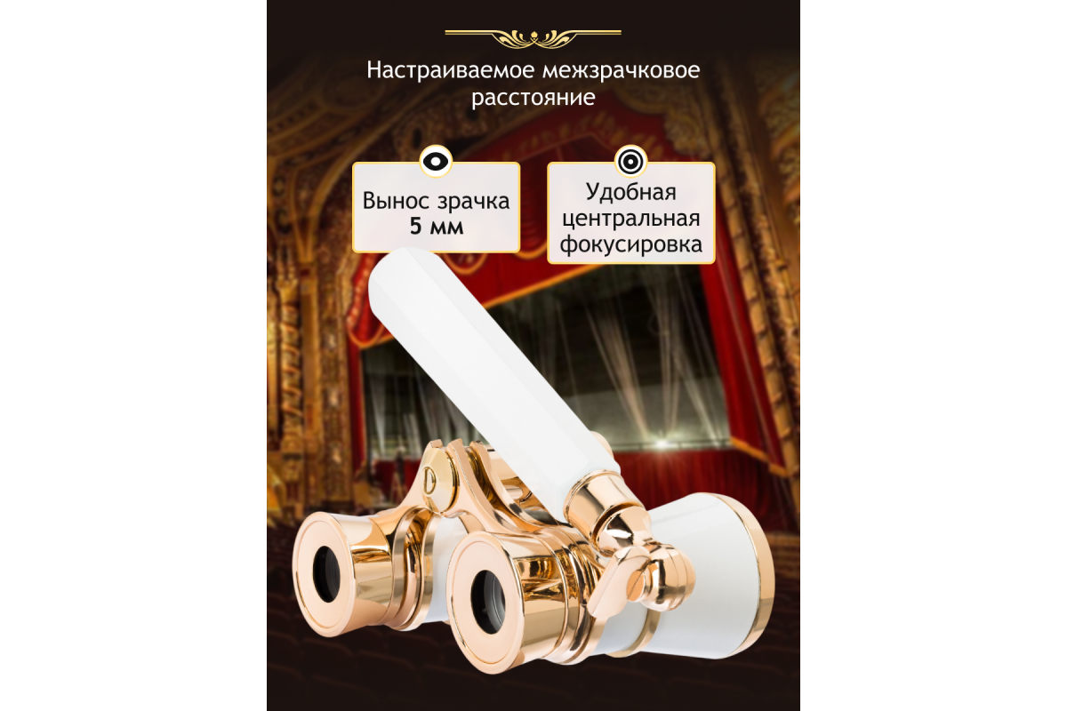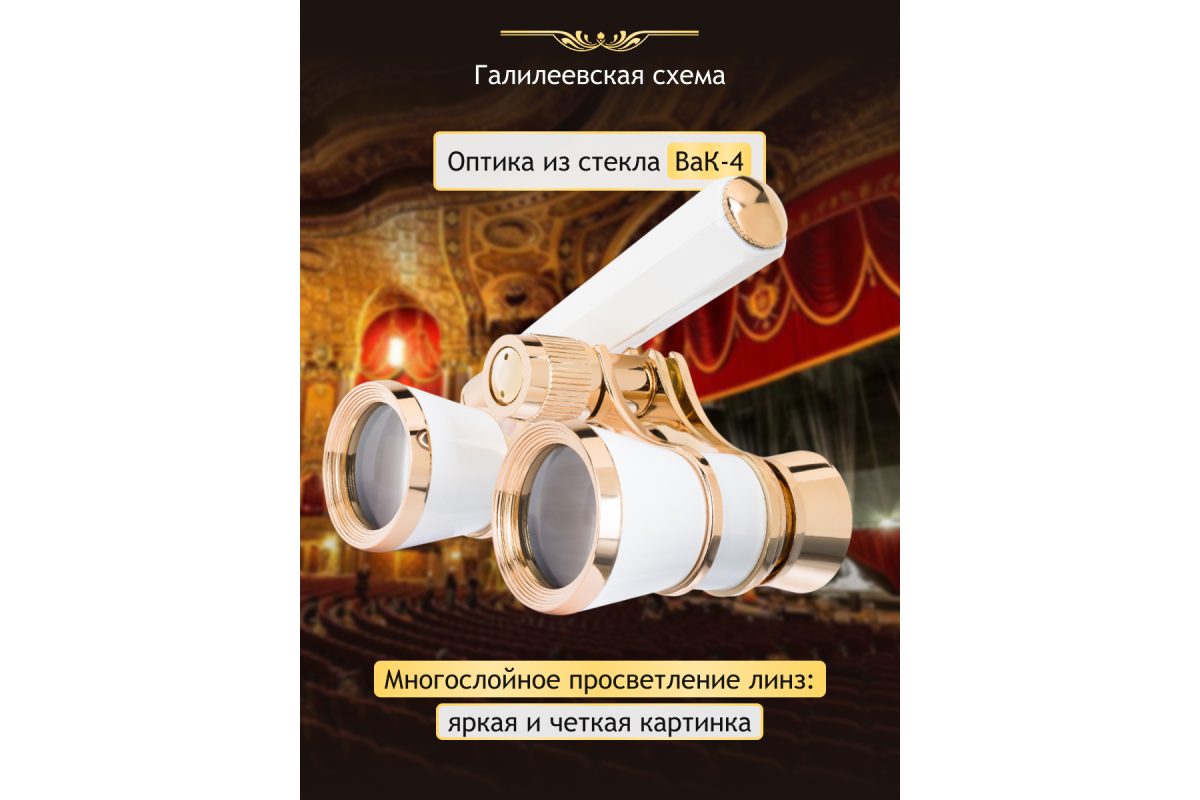 Прибор обладает галилеевской оптической системой, оптика изготовлена из стекла BaK-4. В зрительном зале часто не хватает света – добиться яркой картинки в этом случае помогает полное многослойное просветление линз. Спектакль будет комфортно смотреть из любого ряда: бинокль обеспечивает 3-кратное приближение, сфокусироваться на объекте можно всего в 3,5 метра от него. Прибор можно быстро настроить под любого пользователя – здесь есть опция регулировки межзрачкового расстояния.