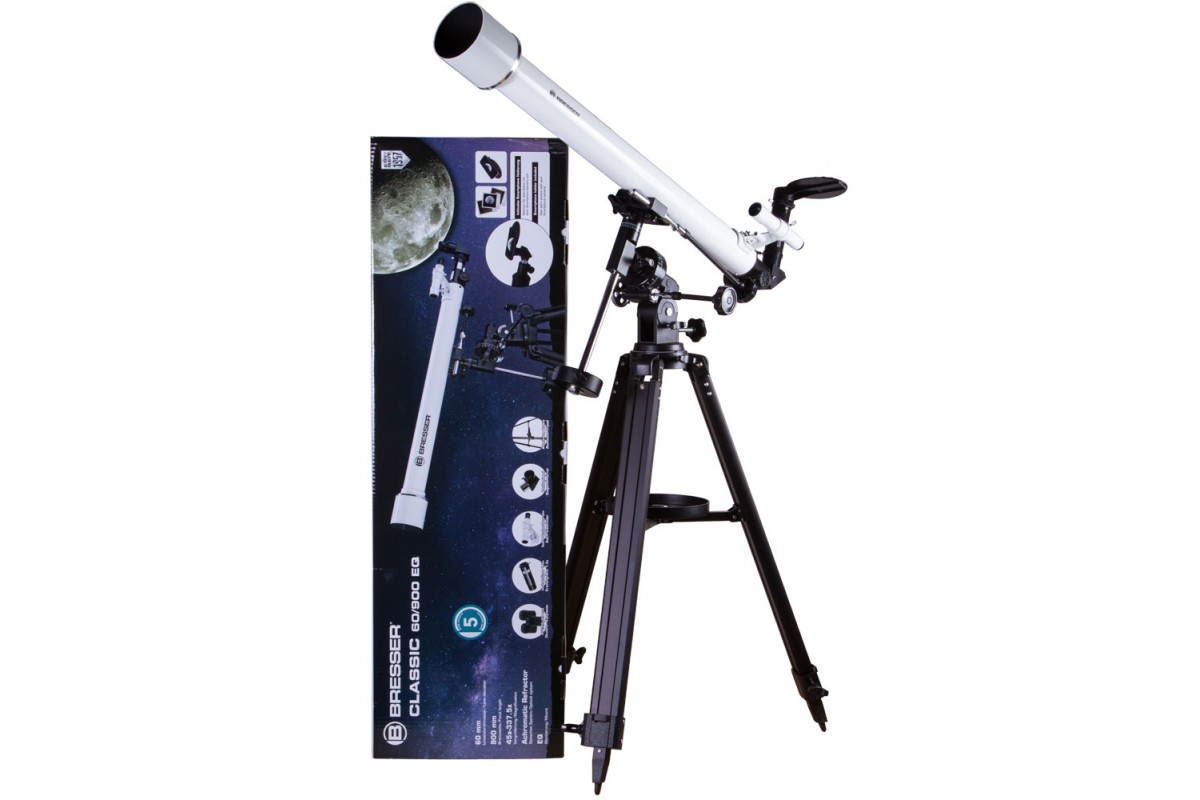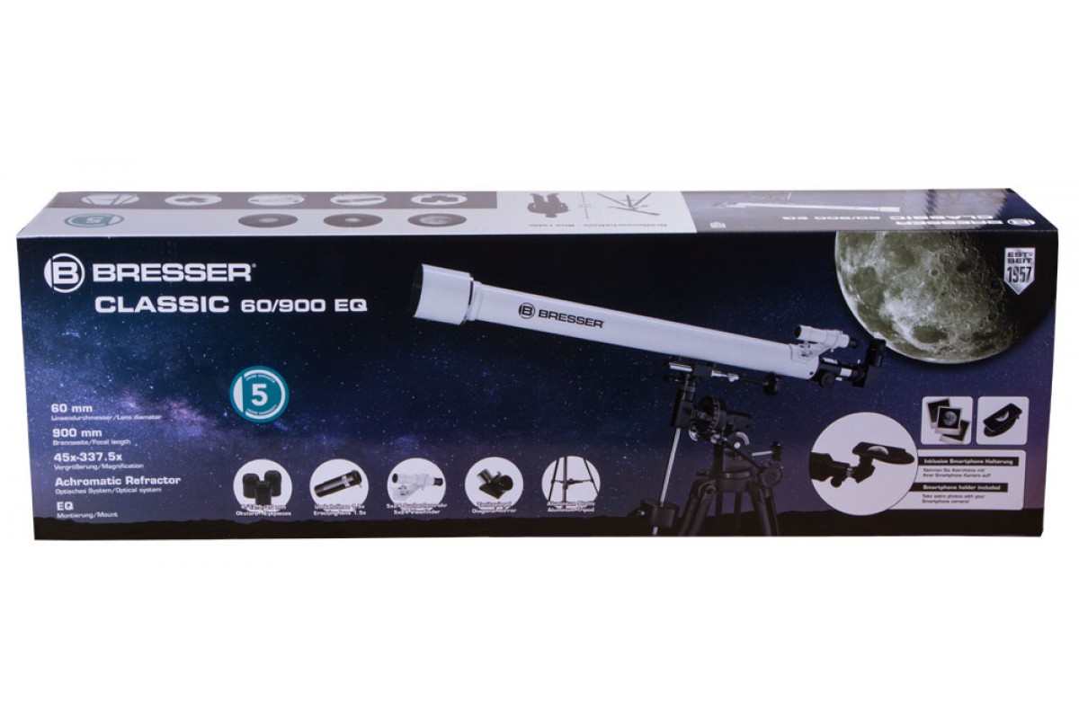 Bresser Classic 60/900 EQ станет настоящей находкой для астронома, мечтающего стать астрофотографом. При помощи специального адаптера (в комплекте) вы сможете фотографировать космос прямо на встроенную камеру смартфона. Мобильное устройство просто закрепляется на окуляре – никакого дополнительного оборудования не нужно.
