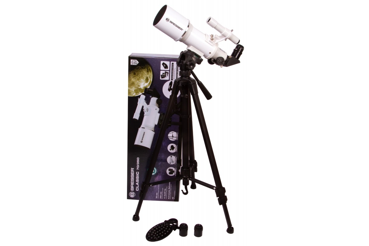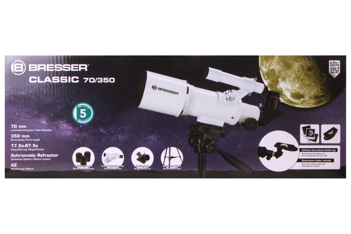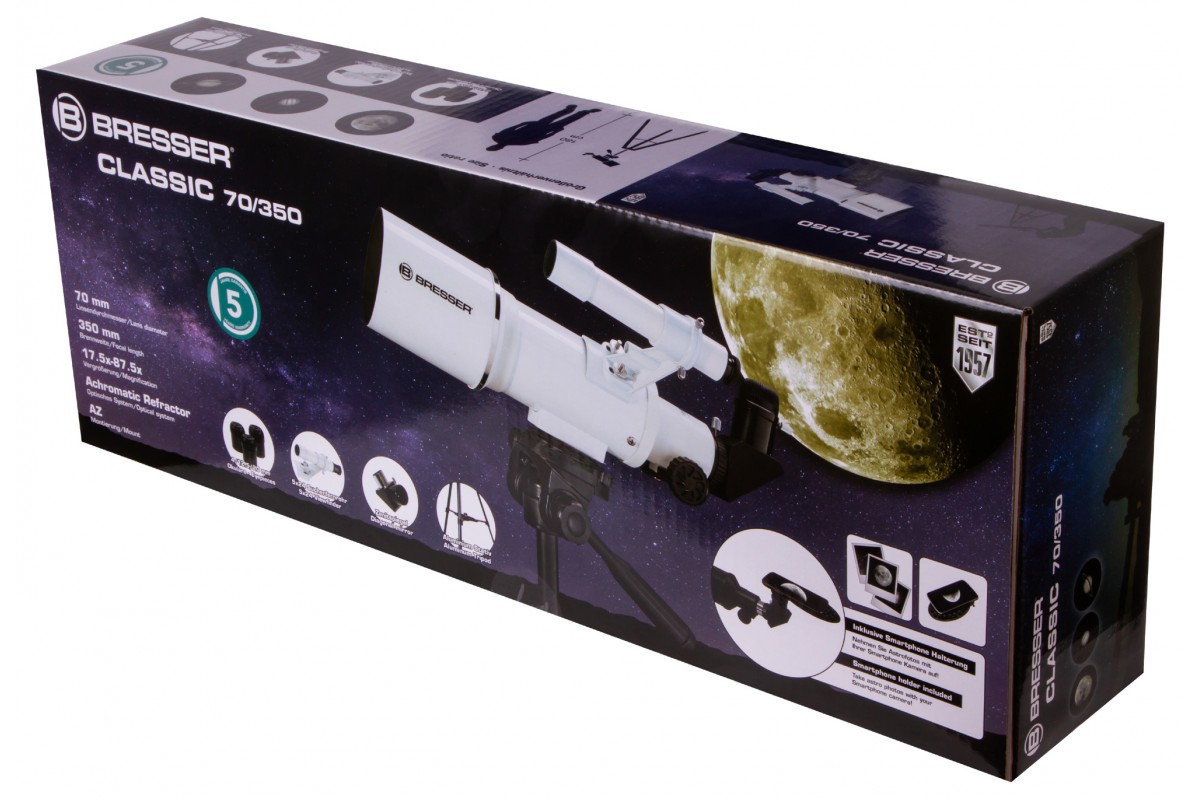 Ахроматический рефрактор Bresser Classic 70/350 AZ – это простое управление, качественное изображение без цветовых искажений и возможность детально изучать ближний космос и наземные объекты. Эта модель интересна богатой комплектацией – здесь есть даже держатель для смартфона, который позволит заниматься астрофотографией. Стоит отметить и высокую светосилу объектива, и небольшие размеры оптической трубы. Bresser Classic 70/350 AZ прекрасно подходит для использования в путешествиях и на загородных астрофестах.