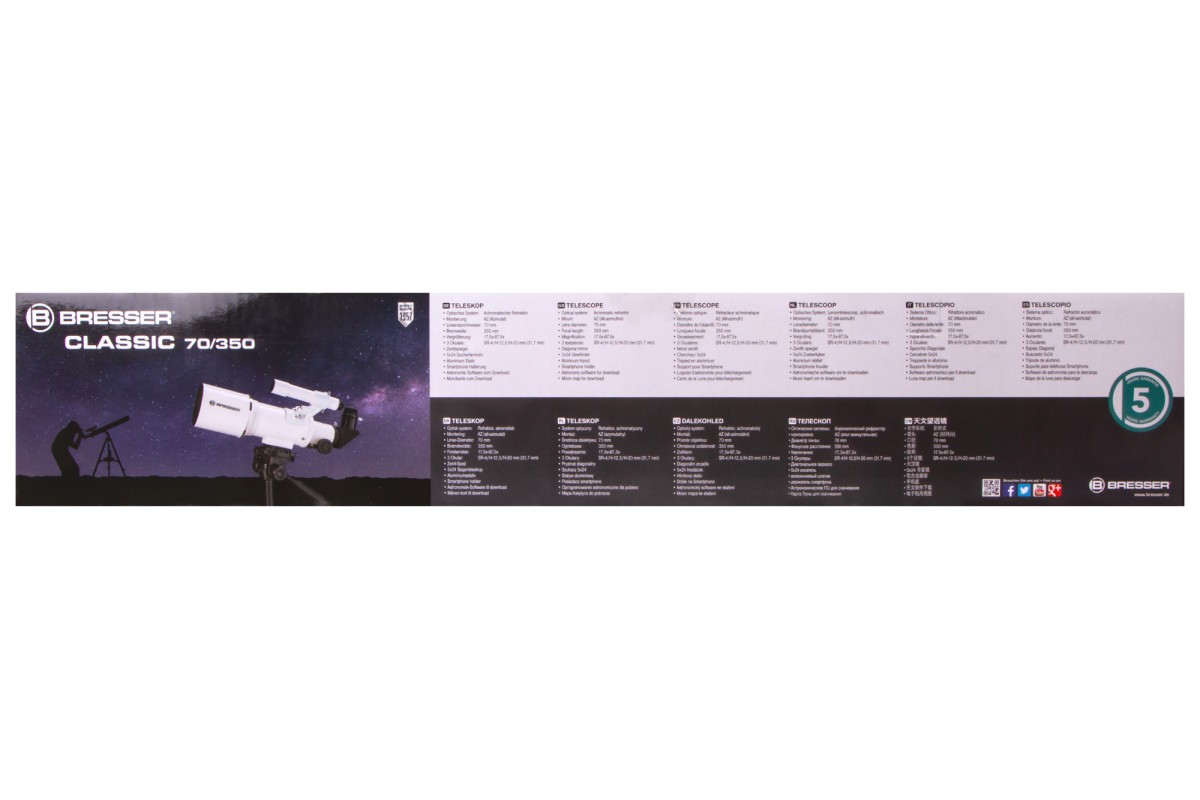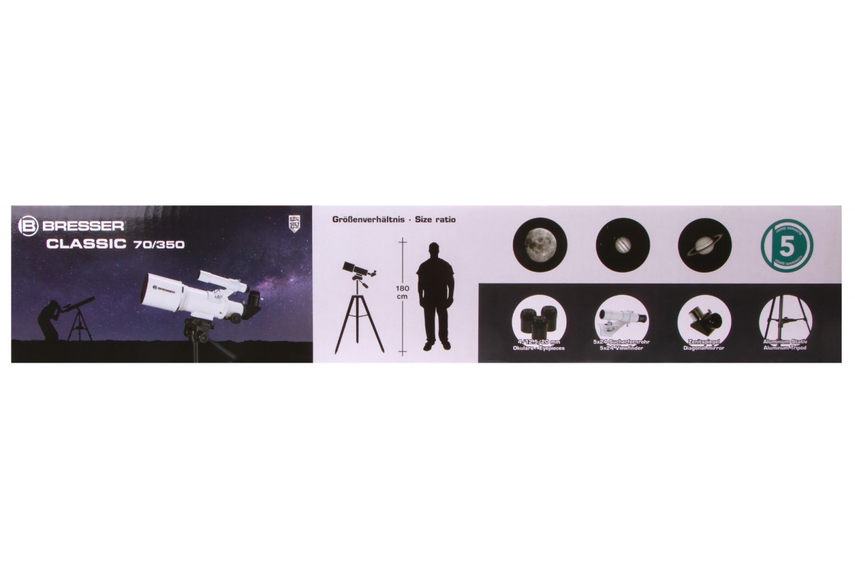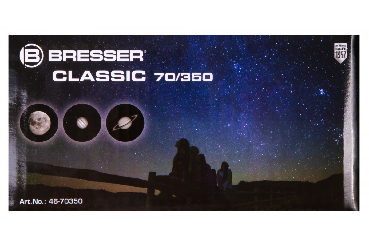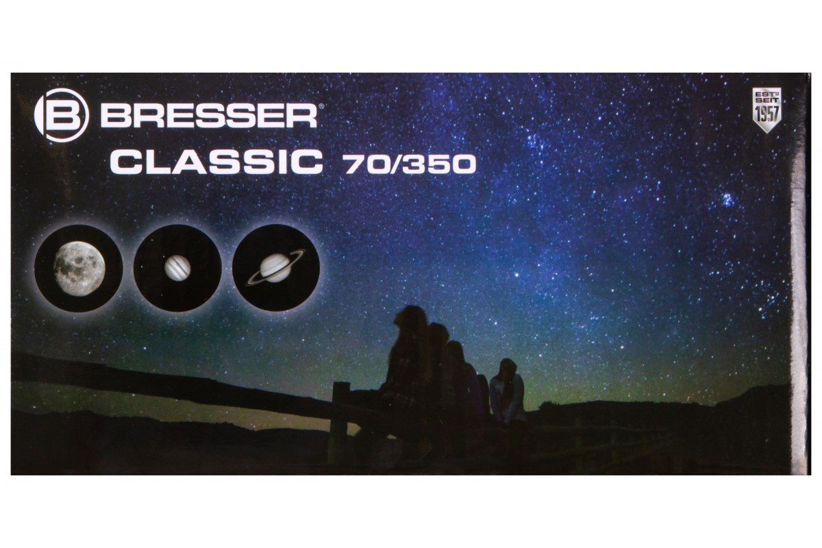 Ахроматический рефрактор Bresser Classic 70/350 AZ – это простое управление, качественное изображение без цветовых искажений и возможность детально изучать ближний космос и наземные объекты. Эта модель интересна богатой комплектацией – здесь есть даже держатель для смартфона, который позволит заниматься астрофотографией. Стоит отметить и высокую светосилу объектива, и небольшие размеры оптической трубы. Bresser Classic 70/350 AZ прекрасно подходит для использования в путешествиях и на загородных астрофестах.