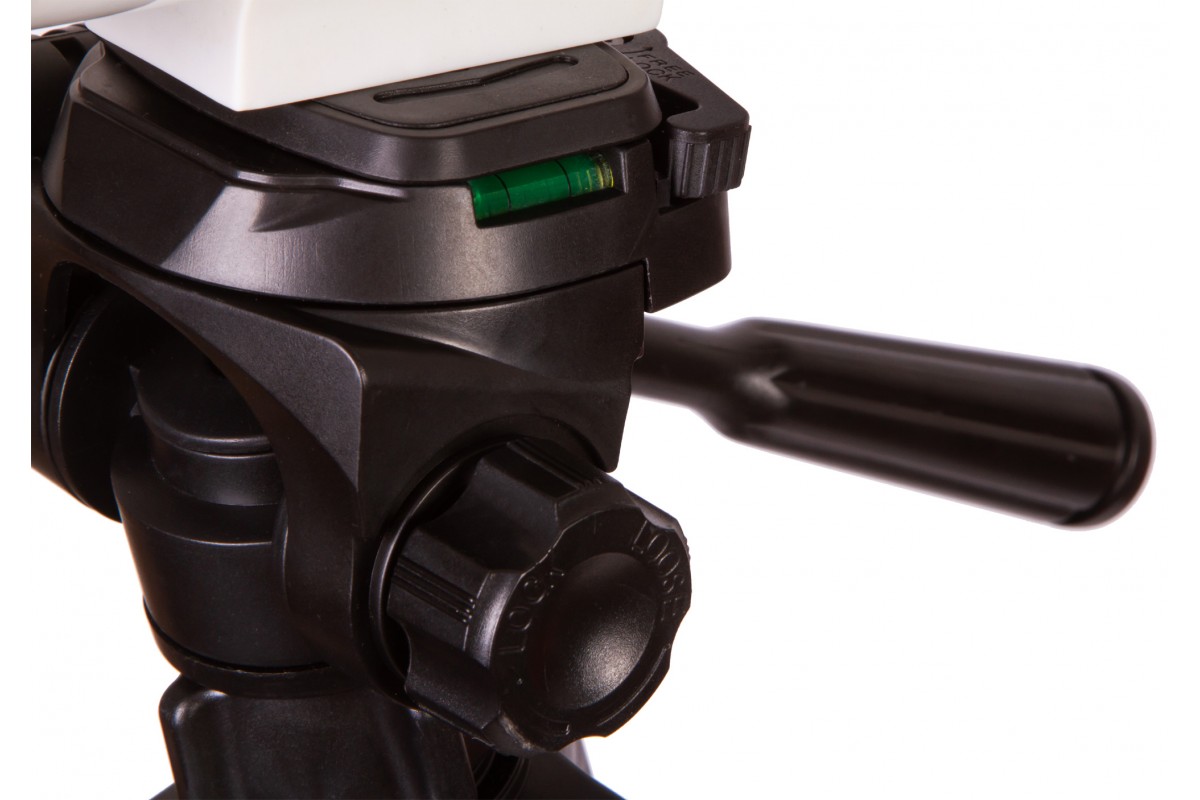 Монтировка установлена на алюминиевую треногу. Высоту каждой ножки можно регулировать отдельно, что позволяет телескопу устойчиво стоять даже на неровной поверхности.