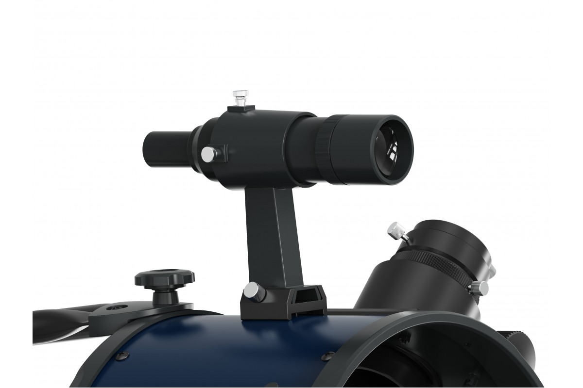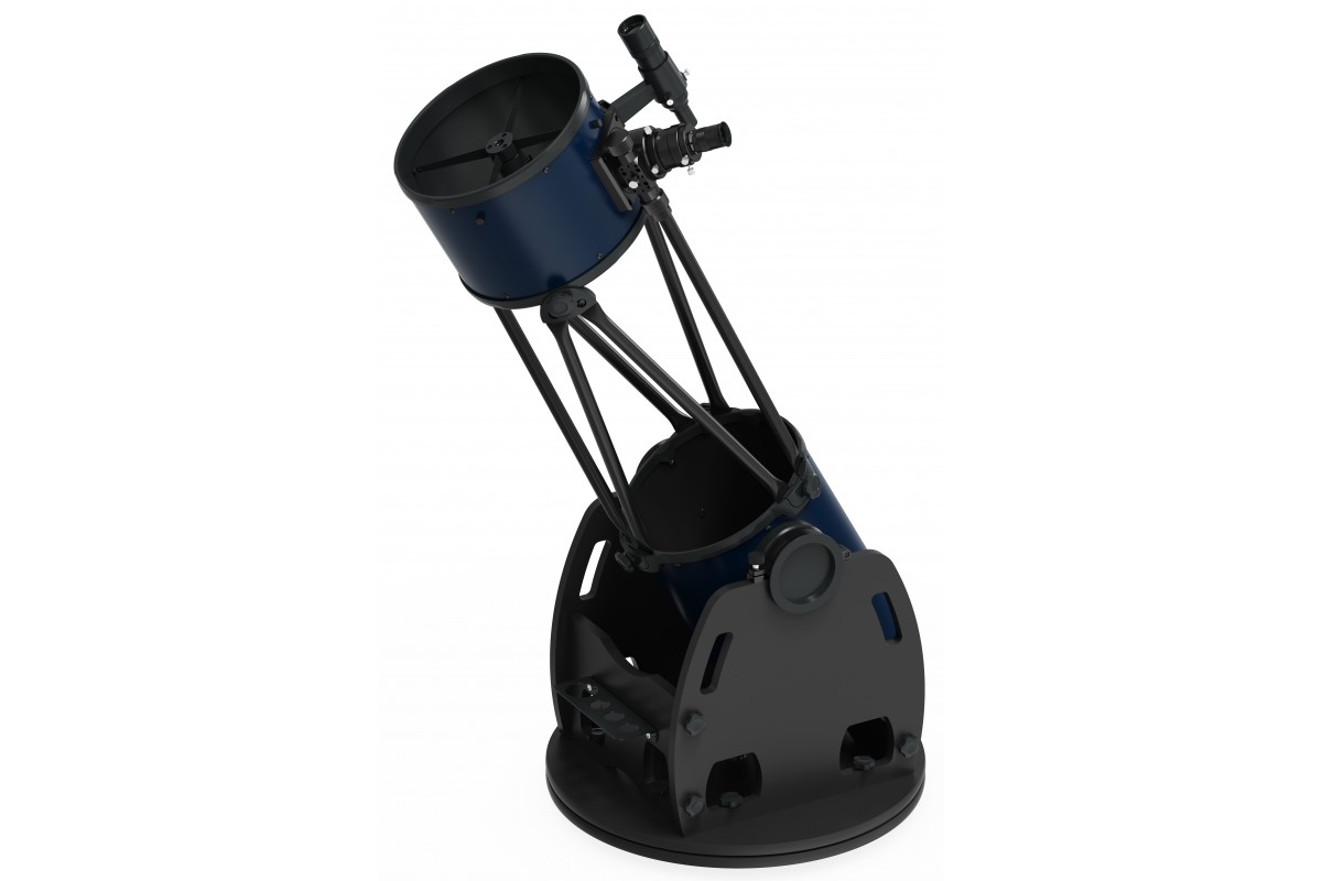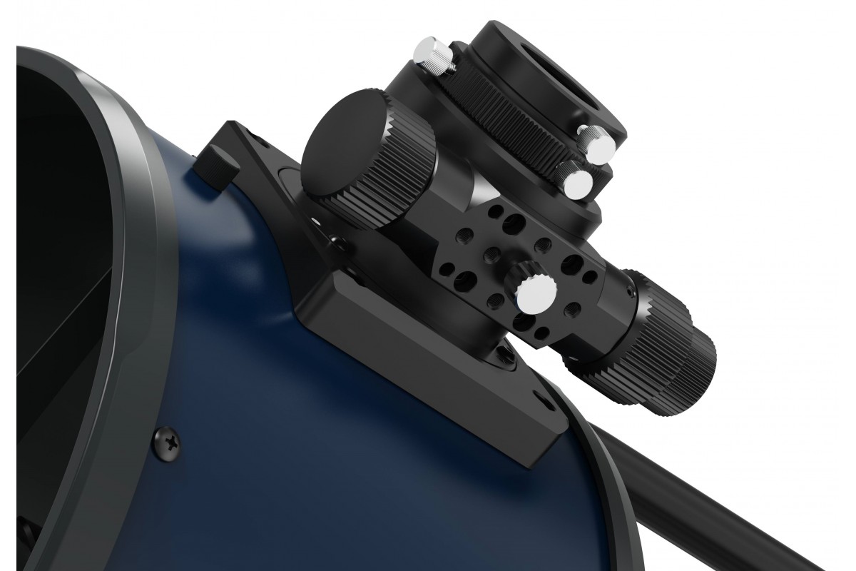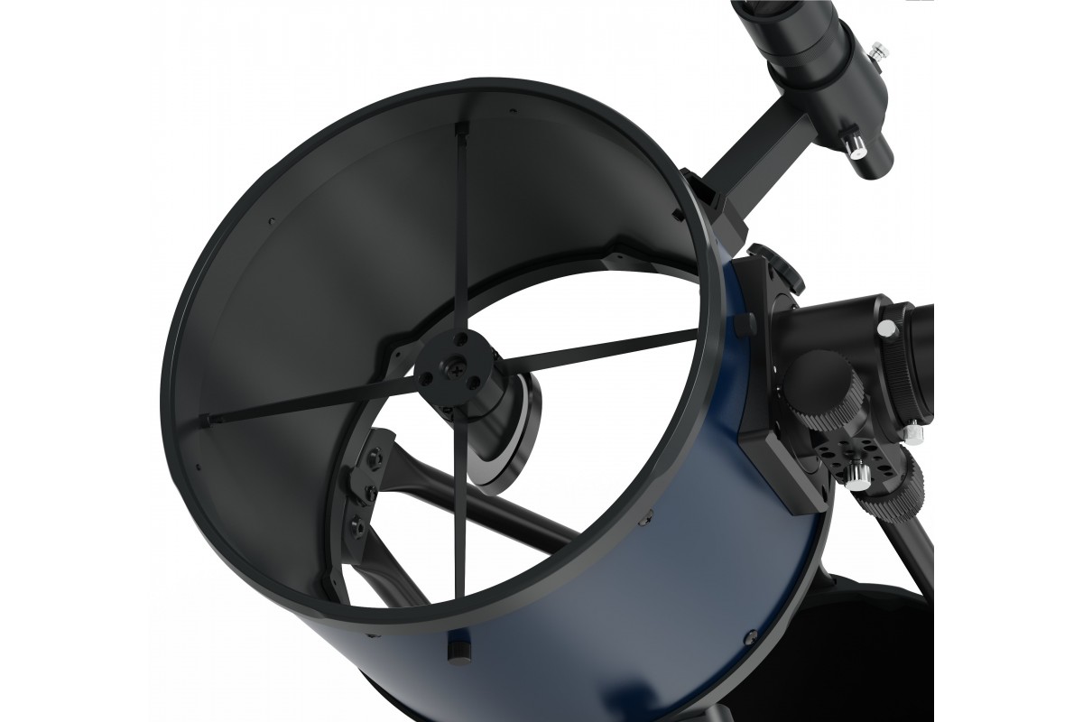 Управление телескопом интуитивно понятно, его быстро освоит даже начинающий астроном. ОТА установлена на устойчивую и простую в использовании монтировку Добсона, изготовленную из качественно обработанного дерева. Для точной настройки резкости видимого изображения служит 2-скоростной реечный фокусер 2" с адаптером на посадочный диаметр 1,25". Максимальное полезное увеличение системы достигает 500 крат. В комплект поставки входят окуляры Plössl 10 и 25 мм (1,25"), которые обеспечивают увеличение 127х и 51х соответственно. Помимо них, набор включает и другие полезные аксессуары: оптический искатель 8х40 для удобного наведения на объекты, вентилятор для активного охлаждения главного зеркала (работает от 8 батареек типа АА, приобретаются отдельно) и защитный чехол для оптической трубы.
