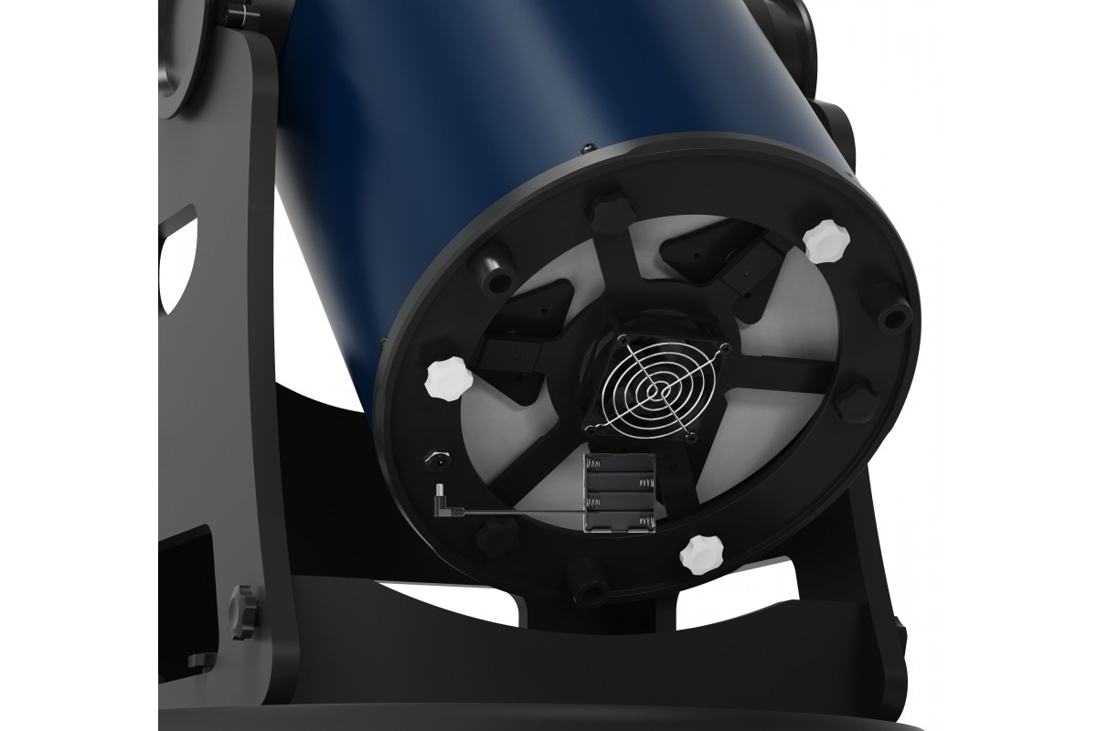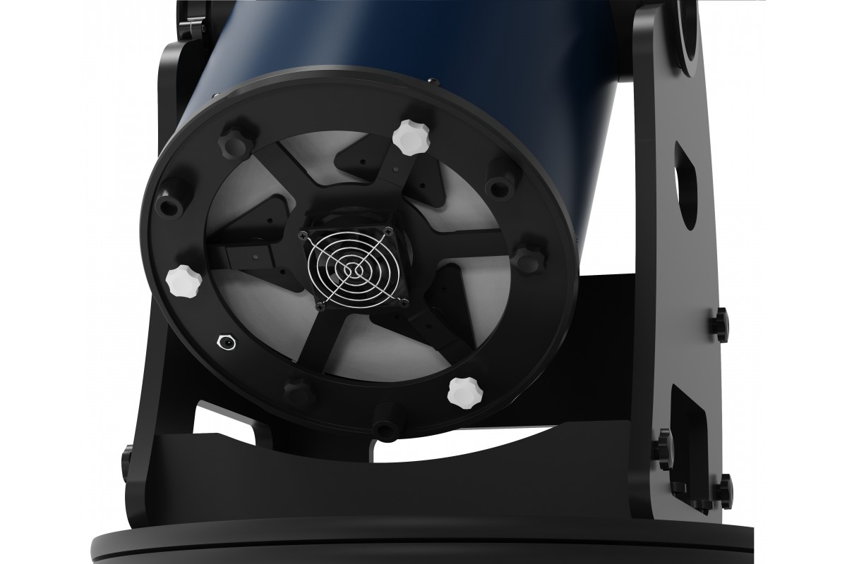 Максимальное полезное увеличение телескопа равно 600 крат – это предельная величина, на которой система будет формировать четкое и удобное для работы изображение. В базовую комплектацию включены окуляры Plössl 10 и 25 мм (1,25"), обеспечивающие увеличение 153х и 61х соответственно – остальные аксессуары подбираются индивидуально под текущие потребности и приобретаются отдельно. Для точной настройки резкости служит реечный 2-скоростной фокусер 2" с адаптером 1,25", что открывает широкие возможности для увеличения оптического потенциала телескопа. Также в комплект поставки входят оптический искатель 8х40 для удобного наведения на объекты и вентилятор для охлаждения/термостабилизации главного зеркала, работающий от 8 батареек типа АА (нет в комплекте).