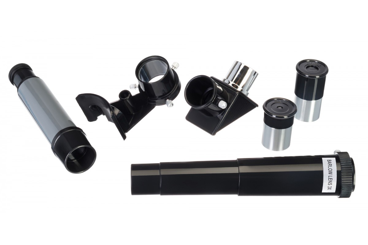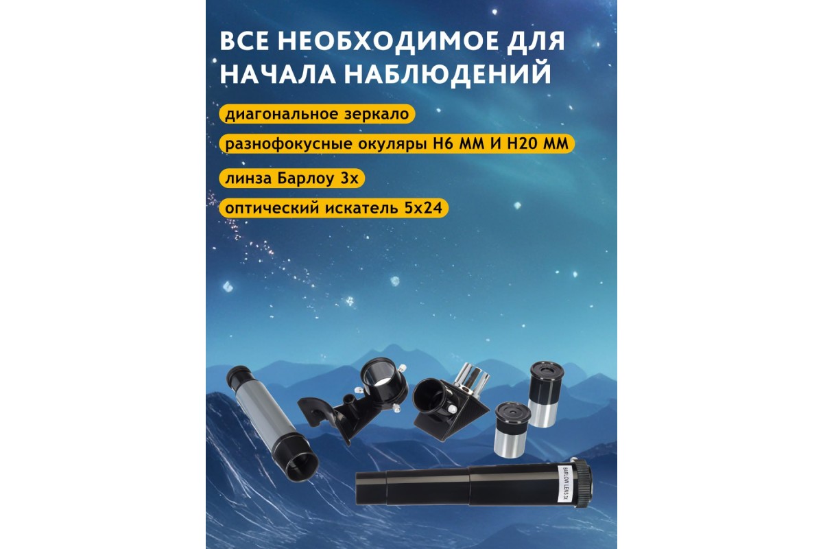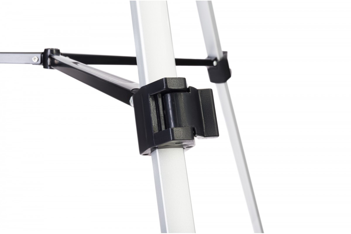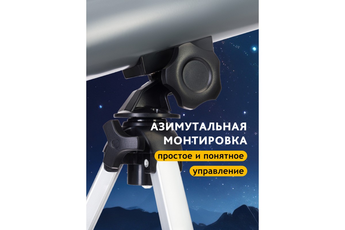 Азимутальная монтировка позволяет свободно наводить оптическую трубу на объекты путем простого поворота в нужную сторону. Тренога сделана из алюминия, она устойчивая и надежная. Лотка для аксессуаров нет, зато присутствует возможность регулировки по высоте.