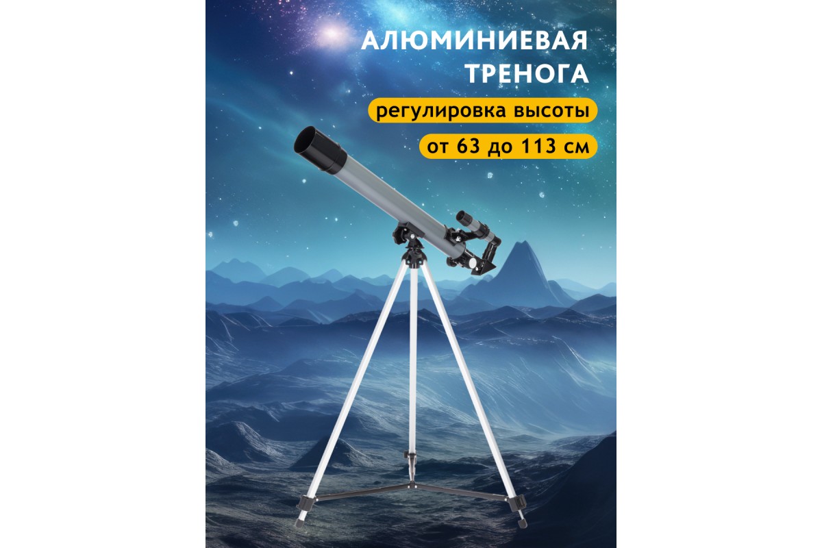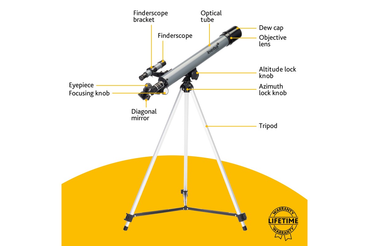 Телескоп собран по схеме ахроматического рефрактора из стеклянных линз с антибликовым покрытием. Световой диаметр составляет 50 мм, поэтому для астрономических наблюдений желательно выбирать яркие объекты ночного неба, например Луну. По наземным объектам прибор передает достойную по качеству картинку даже при слабой освещенности.