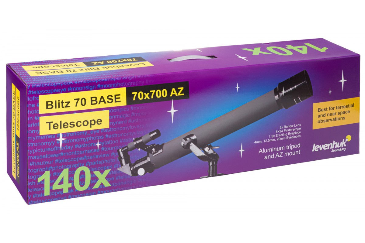 С Levenhuk Blitz 70 BASE новичку будет легко открывать тайны космоса. Этот телескоп создан специально для тех, кто никогда ранее не был знаком с этим оптическим прибором и делает только лишь первые шаги в изучении астрономии. Телескопом легко управлять, он хорошо работает по ближнему космосу, способен показать яркие объекты дальних уголков Вселенной и комплектуется всеми необходимыми аксессуарами.