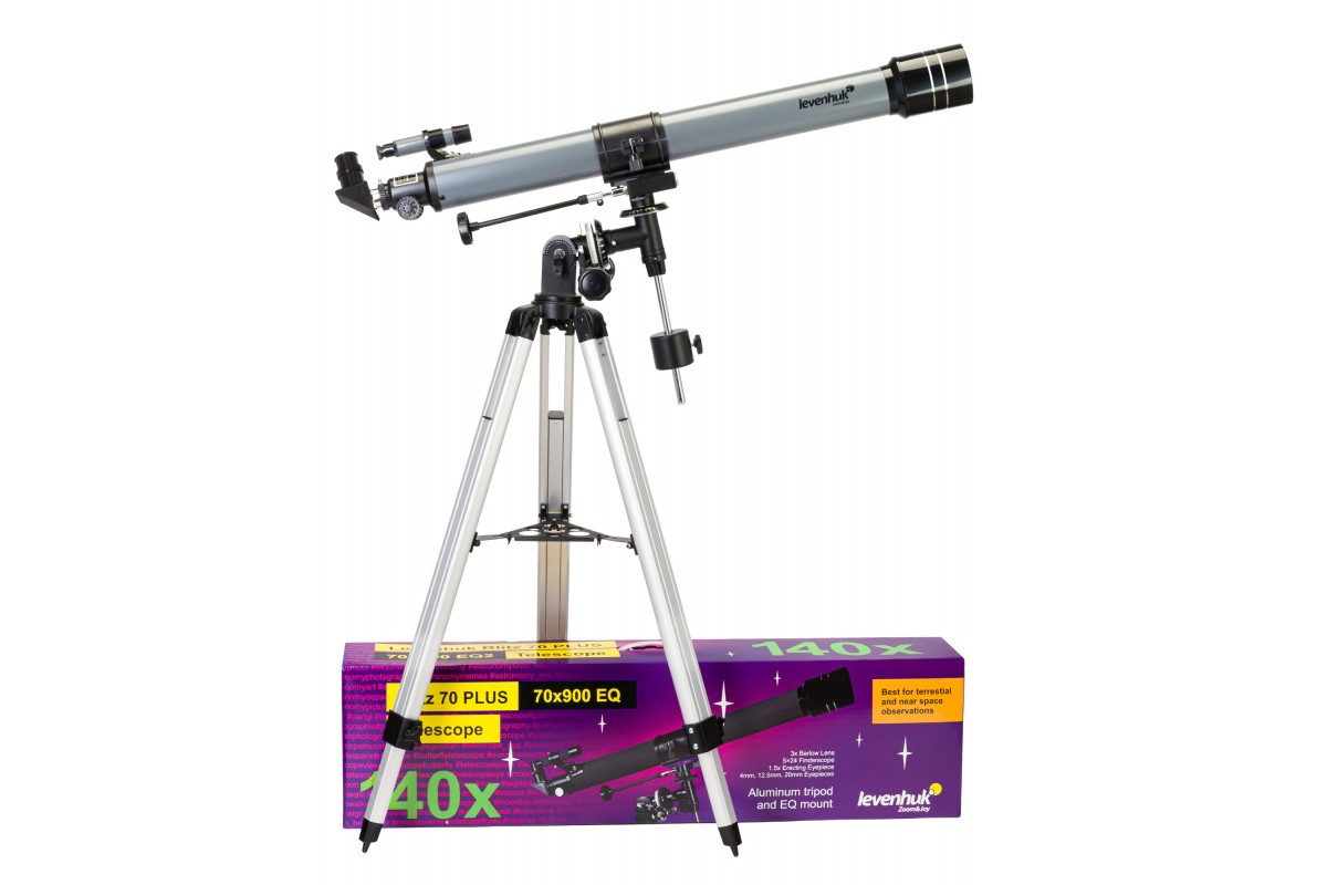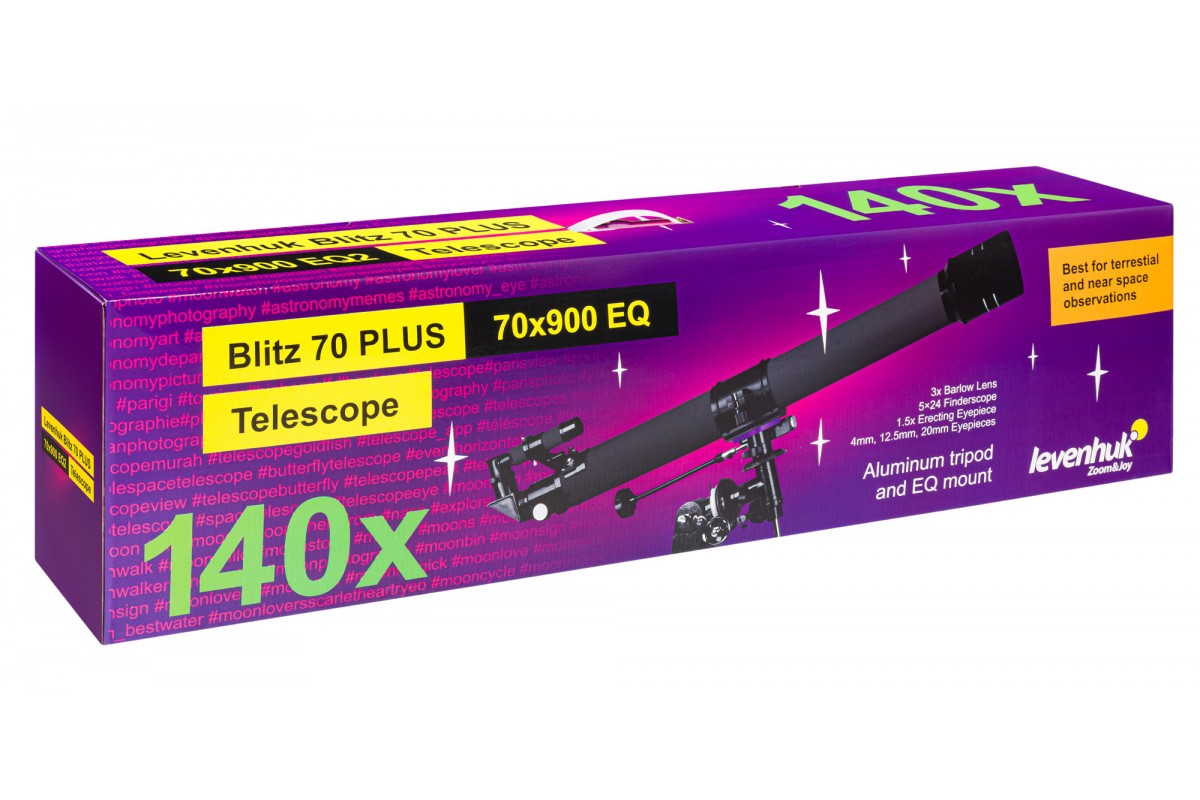 Levenhuk Blitz 70 PLUS – рефрактор-ахромат с исчерпывающей комплектацией. В него можно изучать Луну, планеты Солнечной системы и их спутники, а также яркие объекты дальнего космоса. Телескоп может эффективно работать в условиях городской засветки, удобен и прост в управлении, не требует дополнительных вложений. Также его можно использовать в качестве зрительной трубы для изучения наземных ландшафтов. Этот телескоп – отличный выбор для начинающего астронома.