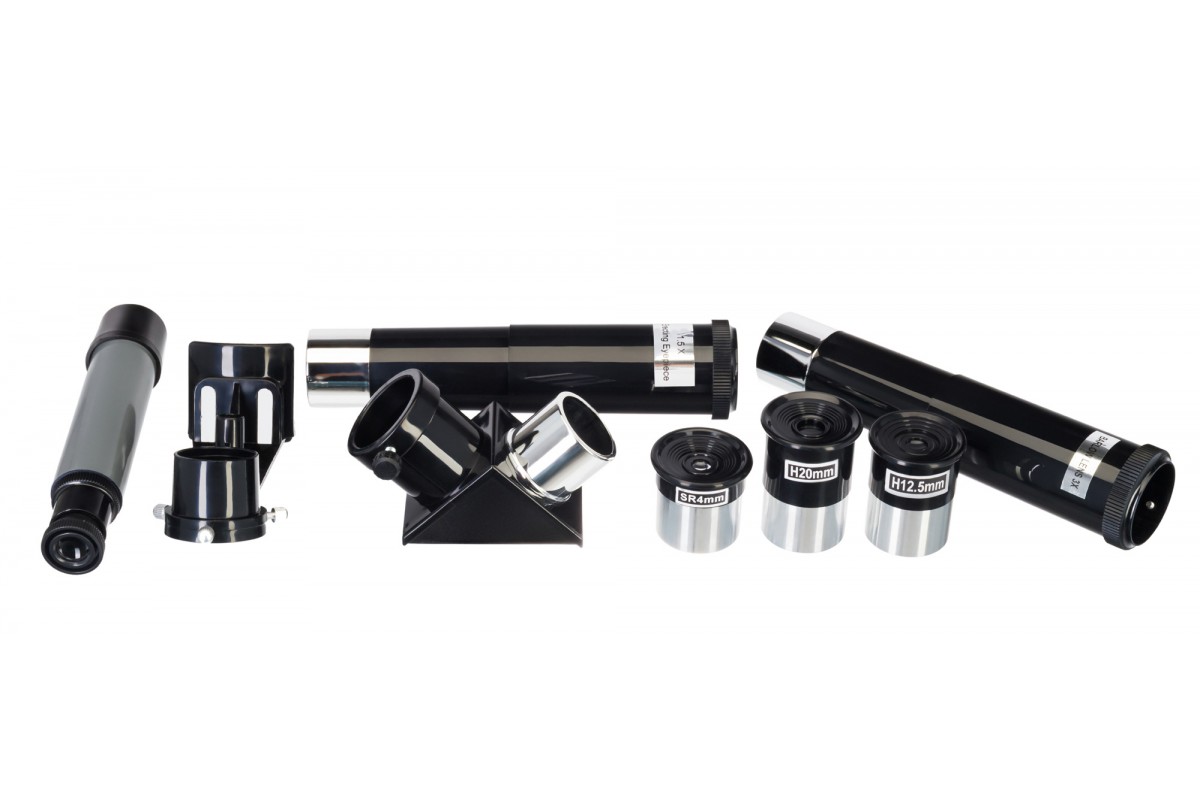 В оптической схеме используются стеклянные линзы с антибликовым покрытием. Это положительно влияет на качество передаваемой картинки, делает ее более четкой и ясной. Телескоп укомплектован множеством оптических аксессуаров, что позволяет использовать при наблюдениях разные увеличения. Более того, благодаря фокусеру 1,25 дюйма на телескоп можно устанавливать дополнительные принадлежности с соответствующим посадочным диаметром. Их можно приобрести отдельно, если требуется решить какие-то специфические задачи.