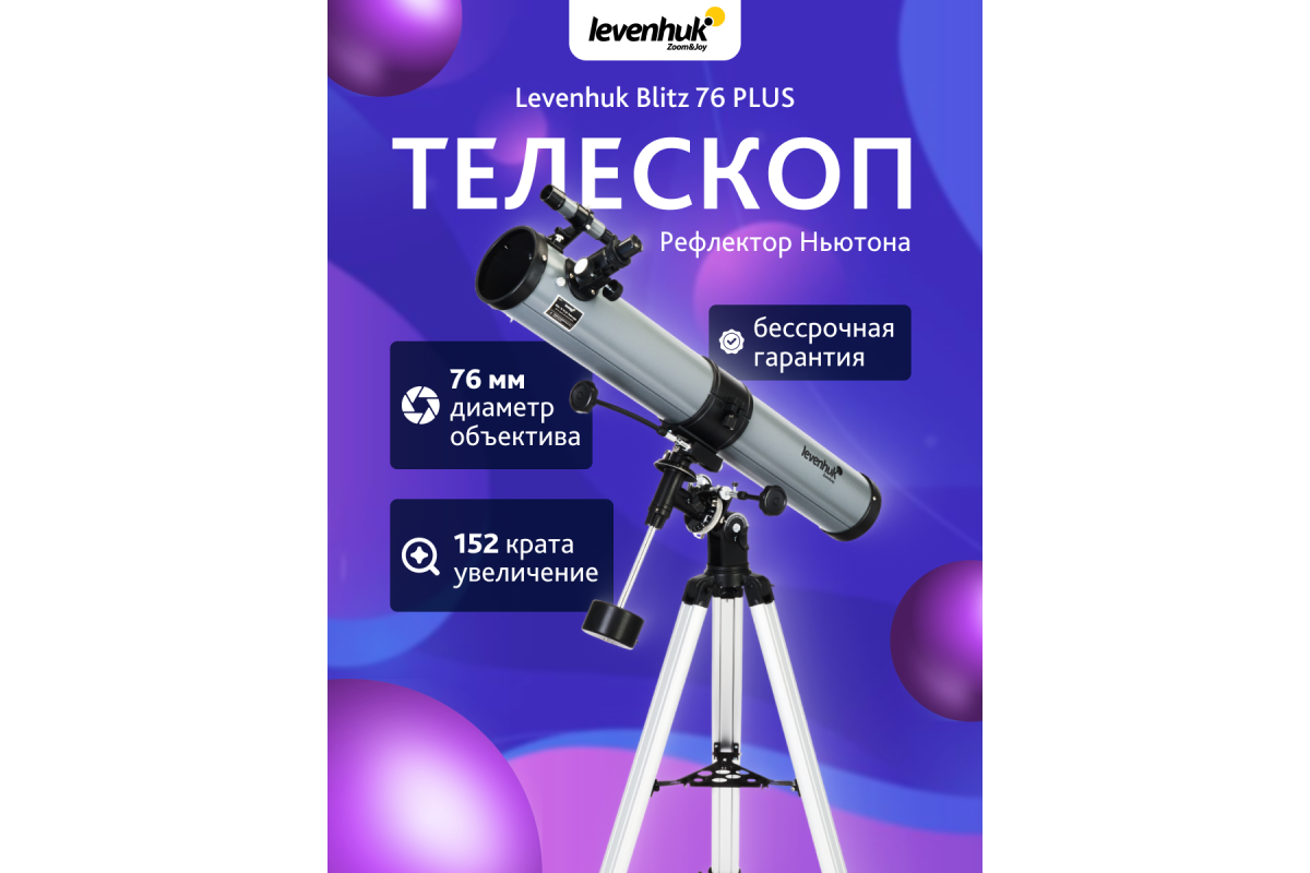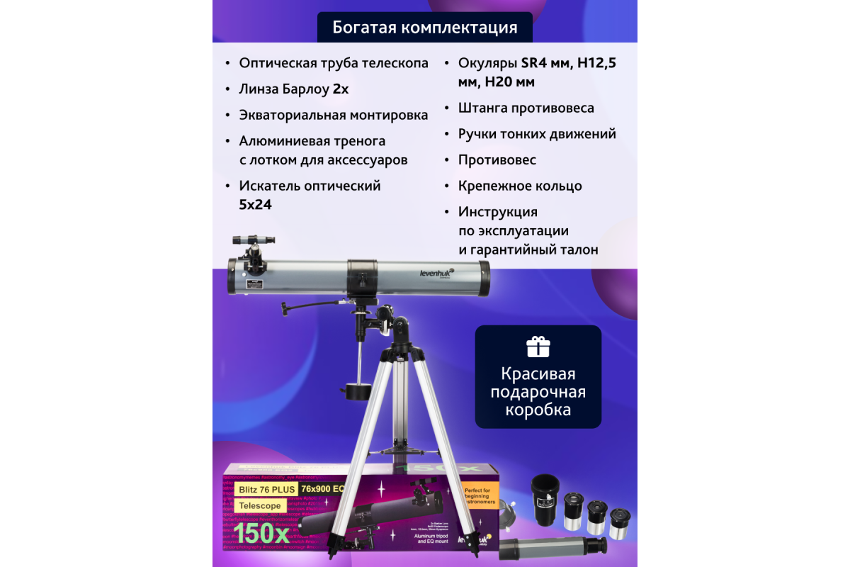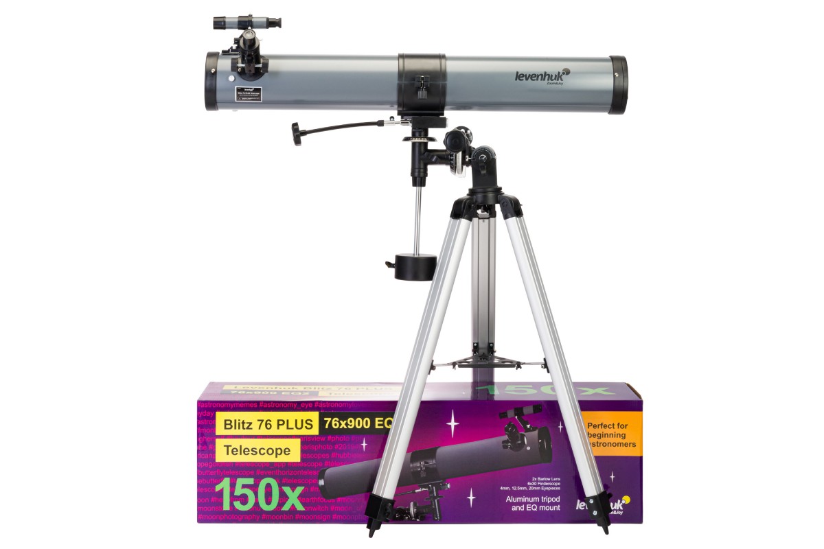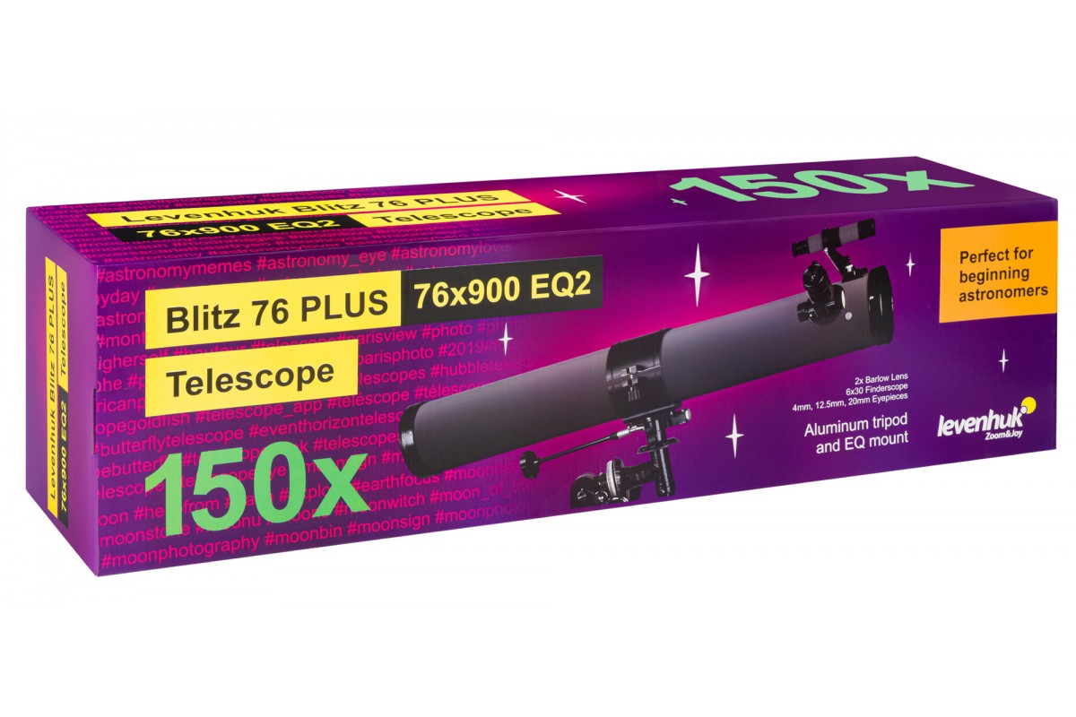 Levenhuk Blitz 76 PLUS – это рефлектор Ньютона на экваториальной монтировке. Возможности телескопа понравятся начинающему пользователю, который хочет сосредоточиться на изучении дальнего космоса. Оптика хорошо показывает звездные скопления, яркие объекты каталога Мессье, двойные звезды и многое другое. Ближний космос тоже доступен для исследования, особенно Луна и планеты земной группы. Так как телескоп уже укомплектован всеми необходимыми аксессуарами, он станет отличным выбором для подарка.