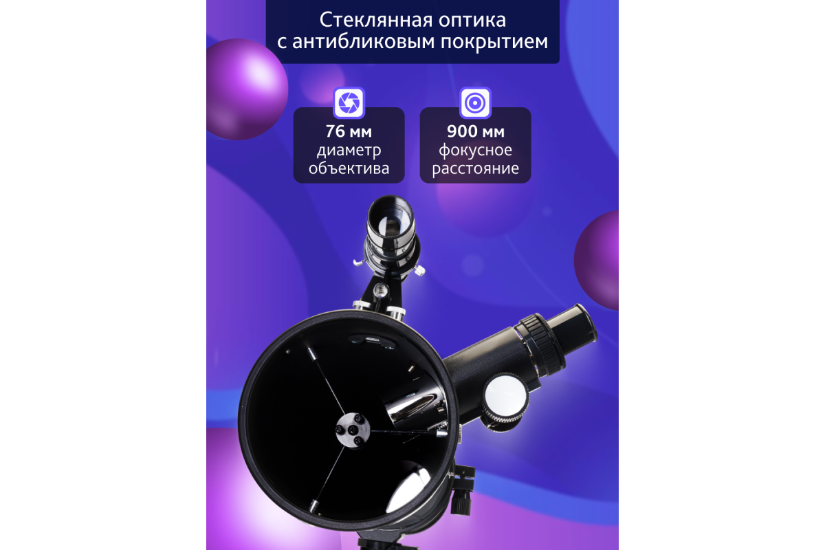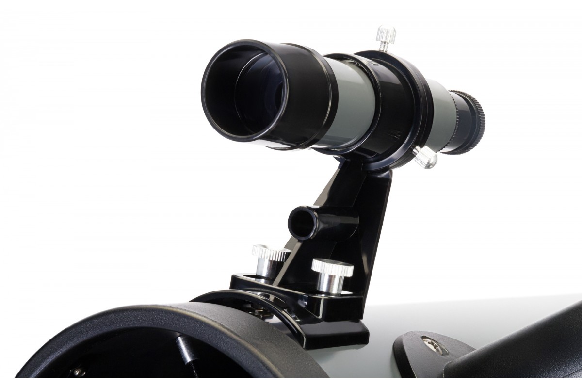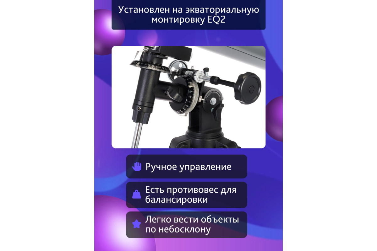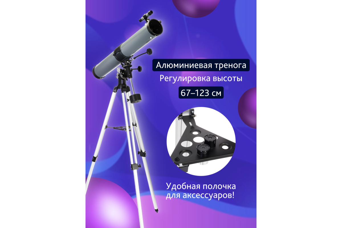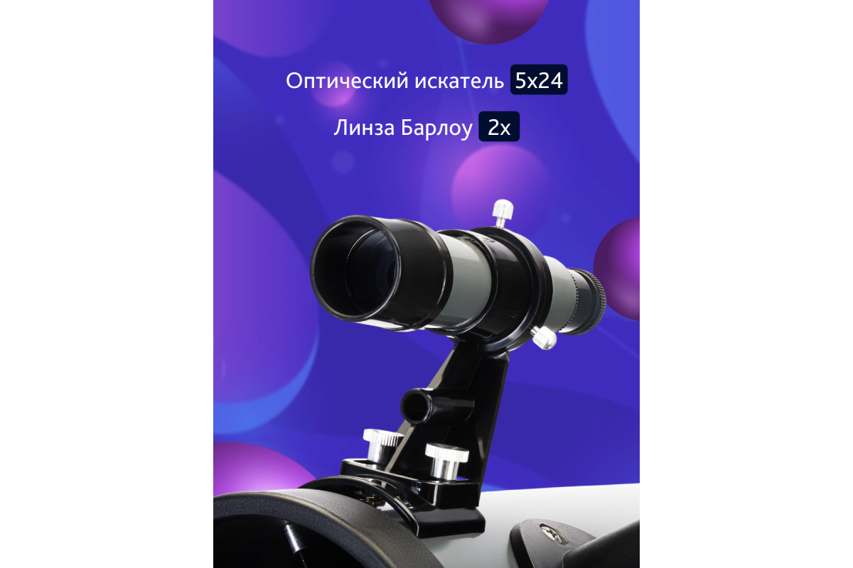 В основе оптической схемы лежит сферическое зеркало. Линзы сделаны из стекла с антибликовым покрытием. Вплоть до максимально полезного увеличения в телескоп можно наблюдать четкую и ясную картинку с минимумом искажений. Для управления используется экваториальная монтировка с ручками тонких движений, с ее помощью очень удобно вести объекты по небосклону.