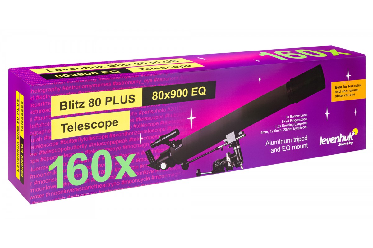 Телескоп Levenhuk Blitz 80 PLUS – ахроматический рефрактор для начинающего, но амбициозного пользователя. С одной стороны, этот телескоп прост в управлении, с другой – позволяет проводить широкий спектр наблюдений. Изучать можно не только Луну, как в менее апертуристые модели, но и многие планеты Солнечной системы, и даже дальний космос. Также этот телескоп может достойно проявить себя в качестве зрительной трубы.