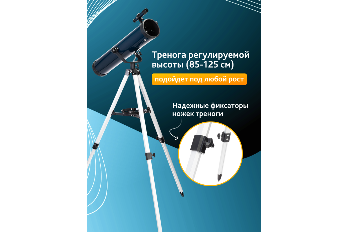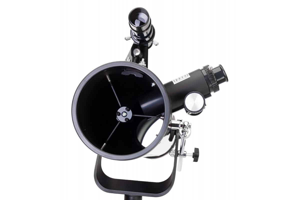 Азимутальная монтировка позволяет максимально просто и удобно управлять телескопом. Благодаря микровинту на вертикальной оси перемещение оптической трубы происходит плавно и точно. Тренога сделана из алюминия, дополнена лотком для аксессуаров. Благодаря регулировке высоты ее легко можно адаптировать под пользователей разного роста.