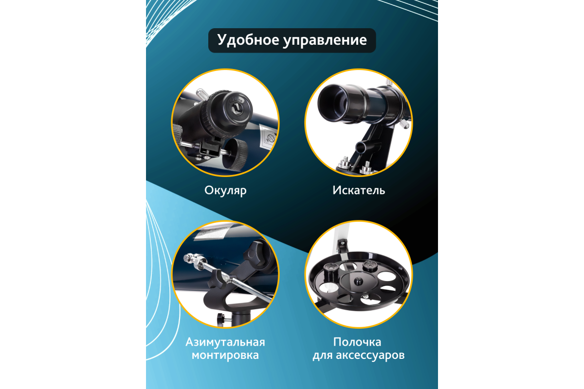 Богатый набор аксессуаров, включающий разнофокусные окуляры и линзу Барлоу, упрощает подбор оптимального для наблюдений увеличения. Благодаря им один и тот же астрономический объект можно изучать на разной кратности, что значительно расширяет наблюдательный опыт. Поиск объектов на звездном небе осуществляется при помощи классического оптического искателя.