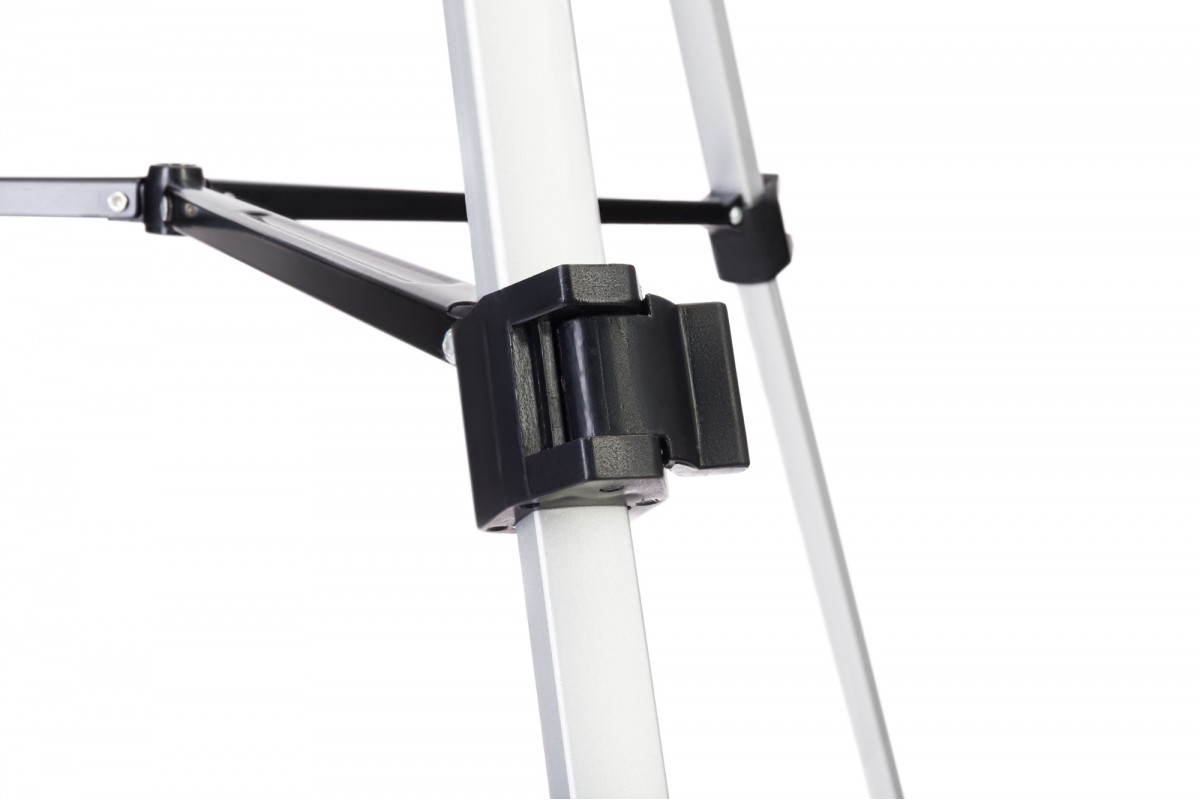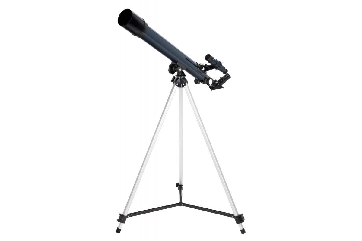 Ахроматическая оптическая схема и антибликовое покрытие линз совершенствуют качество изображения, избавляя его от аберраций. Оптика телескопа выполнена из стекла, а корпус трубы и тренога – из металла. Для наведения используется азимутальная монтировка классического типа, позволяющая перемещать трубу вверх-вниз и вправо-влево. С наведением на астрономические объекты справится пользователь с любым уровнем подготовки. Дополнительно в этом поможет оптический искатель, устанавливаемый на трубу. Высоту треноги можно регулировать в широком диапазоне – это особенно удобно при наблюдениях в телескоп большой компанией.