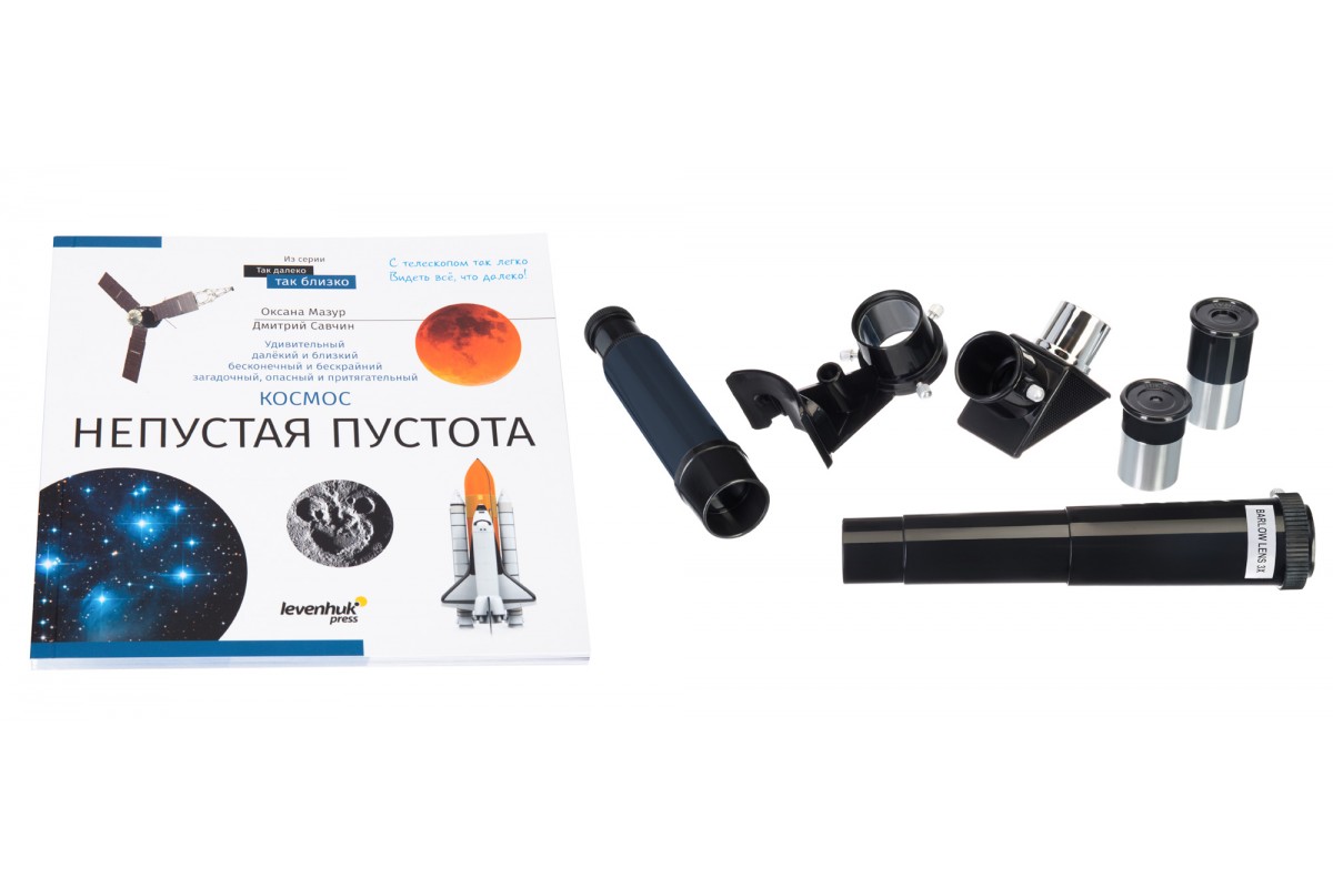 Одно из достоинств телескопа Levenhuk Discovery Spark 506 AZ – расширенная комплектация. В яркой подарочной коробке, помимо самого телескопа, есть множество полезных аксессуаров: два сменных окуляра, диагональное зеркало, 3-кратная линза Барлоу. Яркая книга знаний «Космос. Непустая пустота» содержит в себе ответы на множество вопросов начинающего исследователя космоса.