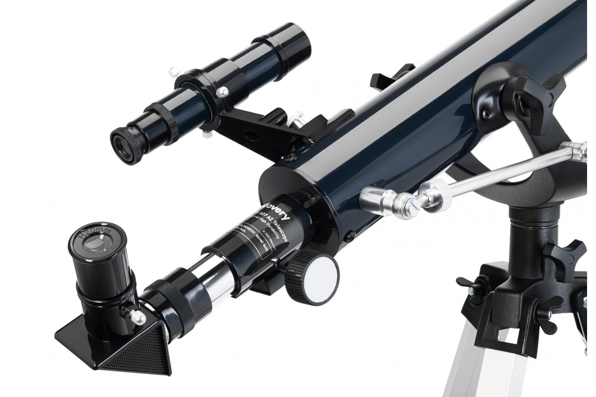 Levenhuk Discovery Spark 607 AZ – не просто рефрактор, а рефрактор-ахромат: в нем скорректированы цветовые искажения. В сочетании с качественной стеклянной оптикой и покрытием с антибликовым эффектом это дает яркую, четкую, хорошо читаемую картинку астрономических объектов. За точное наведение на небесные тела отвечает вилочная монтировка азимутальной ориентации, дополненная винтом на вертикальной оси. Тренога и труба телескопа выполнены из металла, высоту треноги можно регулировать в широком диапазоне.