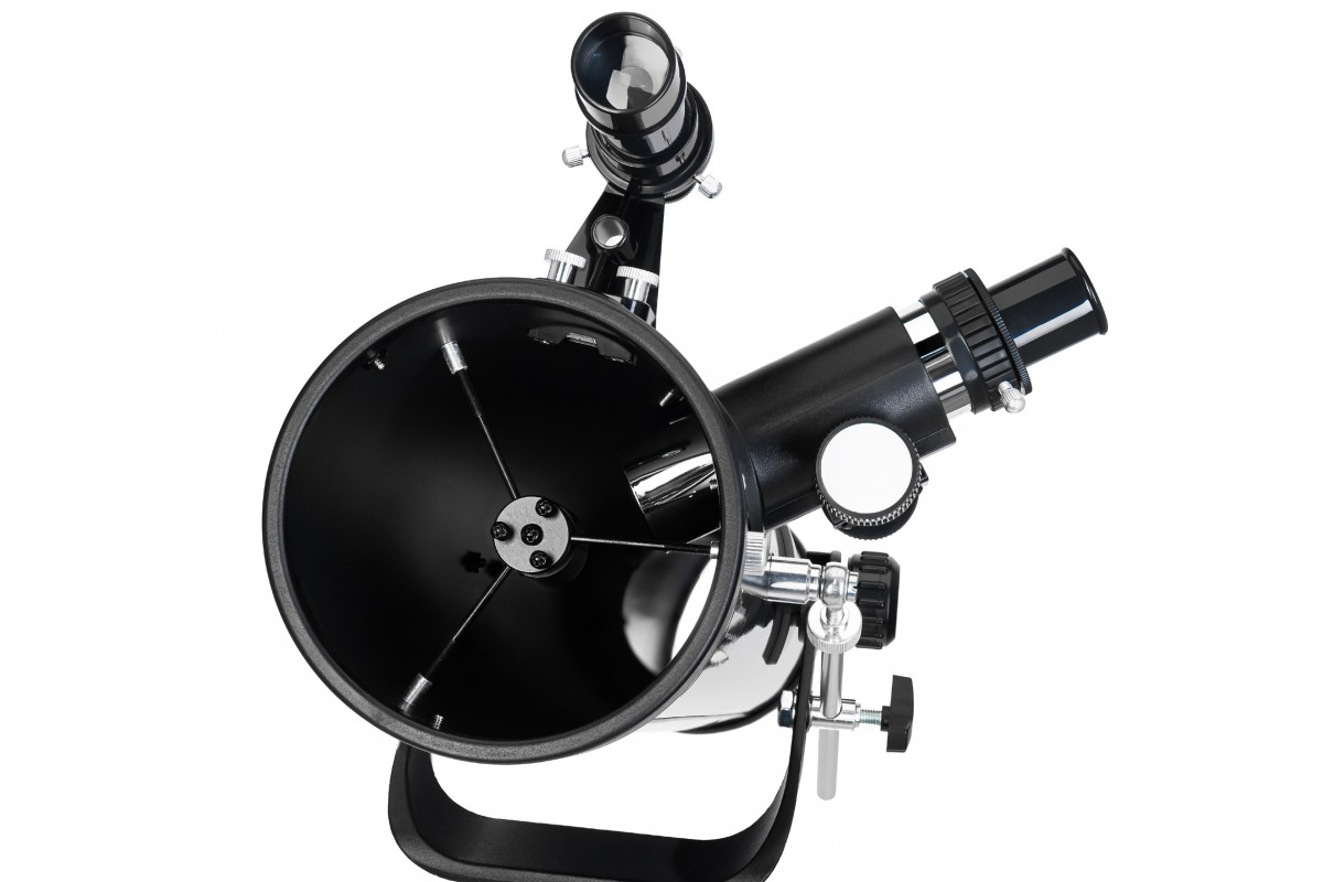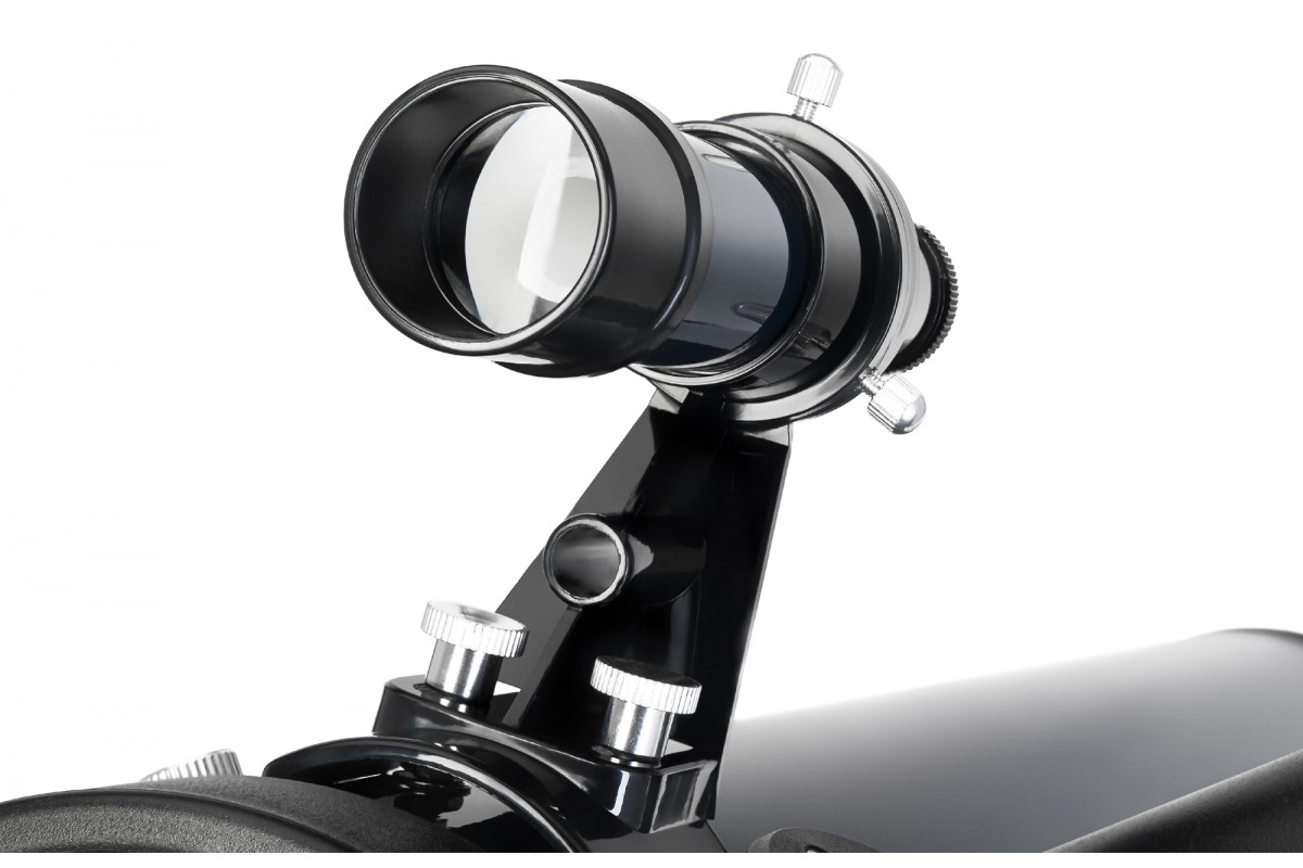 Главный элемент оптической системы Levenhuk Discovery Spark 767 AZ – зеркало сферической формы. Оптика сделана из стекла с антибликовым покрытием, благодаря чему формирует информативное изображение высокого качества. Вилочная азимутальная монтировка позволяет перемещать оптическую трубу телескопа по горизонтали и вертикали. Высокую точность настройки и плавность наведения обеспечивает микровинт, которым дополнена вертикальная ось. В наведении на астрономические объекты также помогает комплектный искатель.