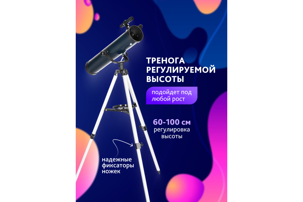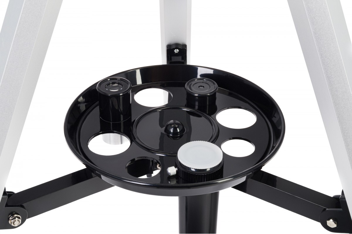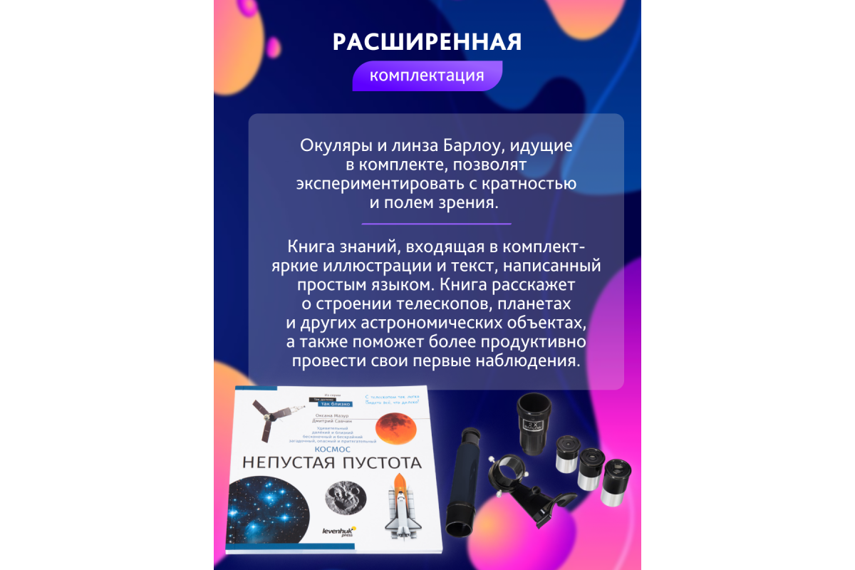 В комплектации есть сменные окуляры и линза Барлоу, повышающая степень приближения оптики вдвое. Комбинируя эти аксессуары, можно экспериментировать с кратностью увеличения. В процессе наблюдений дополнительные принадлежности удобно размещаются на лотке треноги, высоту которой можно настраивать. Отдельно отметим книгу знаний «Космос. Непустая пустота» – это увлекательный путеводитель по космосу, который поможет приступить к процессу наблюдений, вооружившись базовыми астрономическими знаниями.
