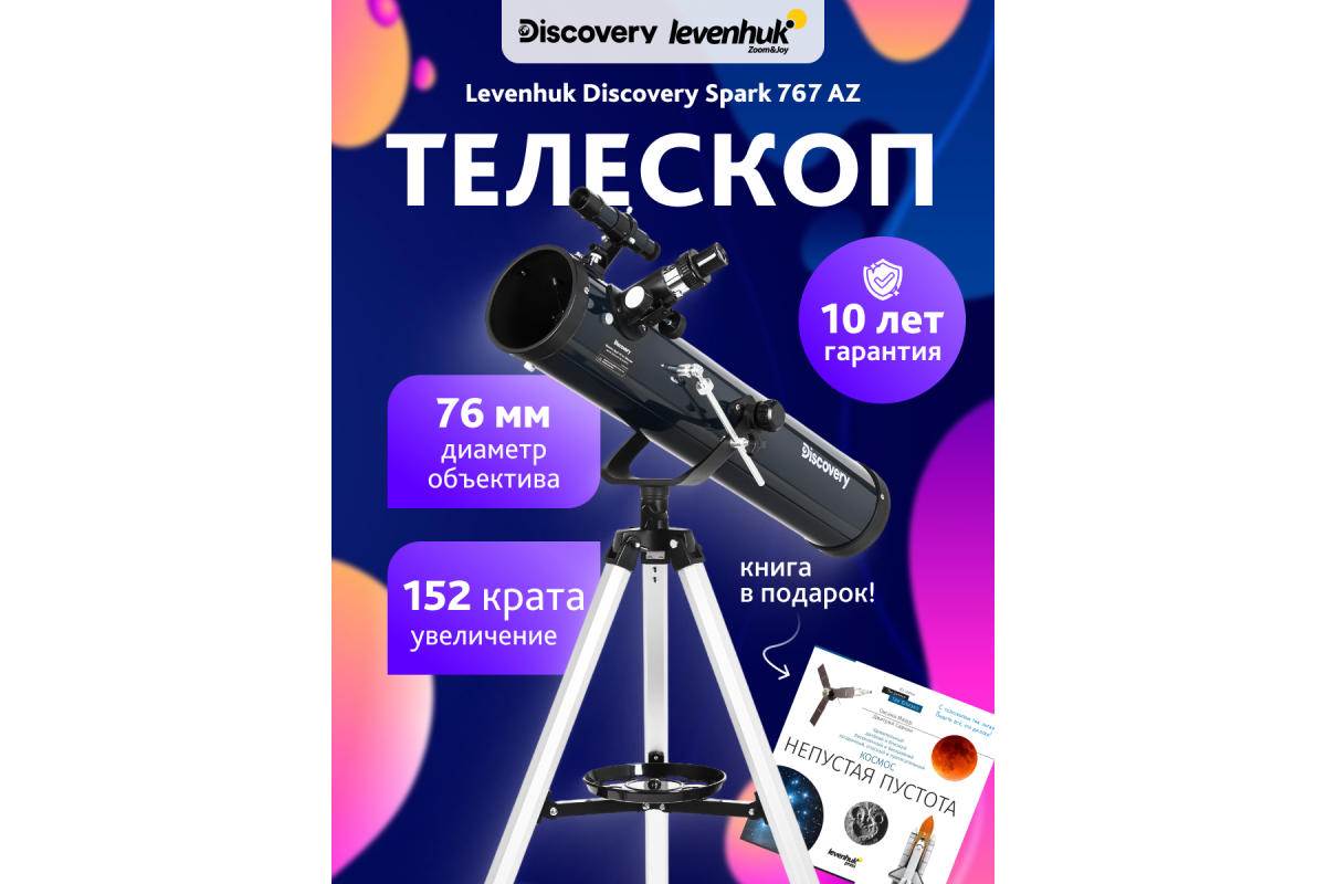 Телескоп Levenhuk Discovery Spark 767 AZ представляет собой классический рефлектор Ньютона начального уровня. Он предназначен для наблюдения объектов дальнего космоса, таких как двойные звезды, туманности, звездные скопления. Для наблюдений доступны практически все объекты Мессье (без подробностей). Что касается ближнего космоса, эта модель поможет увидеть спутник Земли и ближайшие к нам планеты. А благодаря простому управлению освоить процесс наблюдений сможет даже новичок.