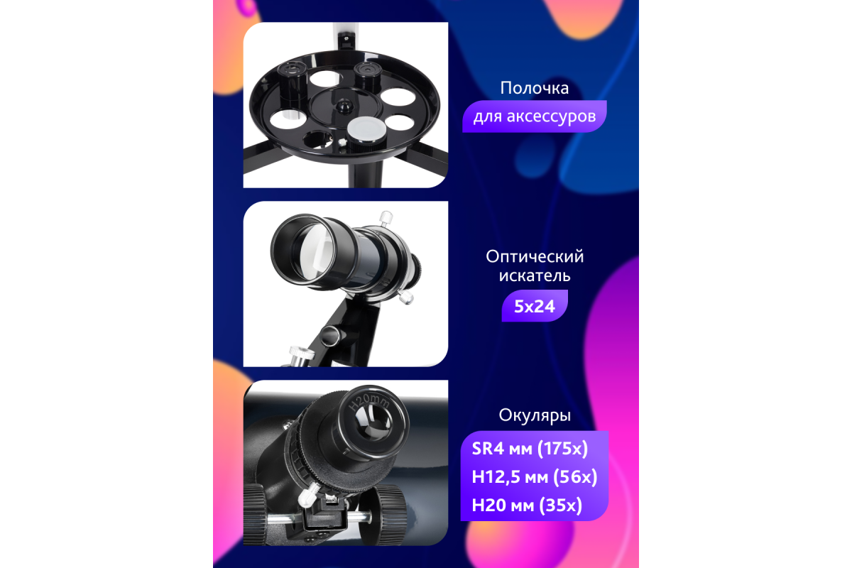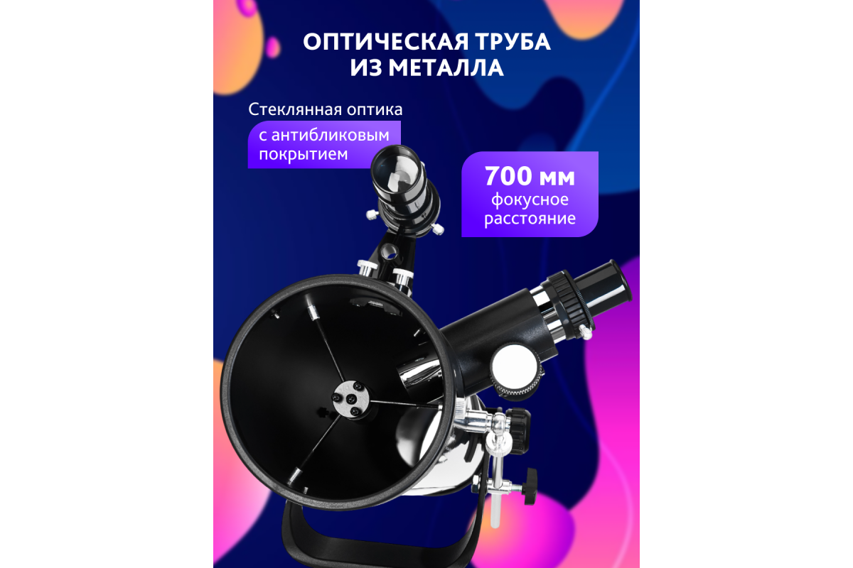 - Технические характеристики|Форма линзы (зеркала): сфера|Способ крепления трубы: винты|Материал трубы: металл|Диаметр главного зеркала (апертура)
