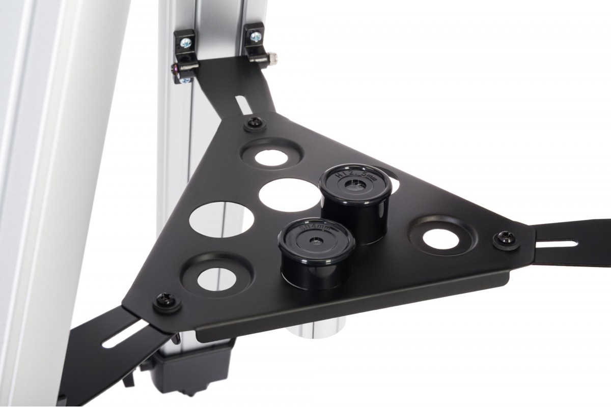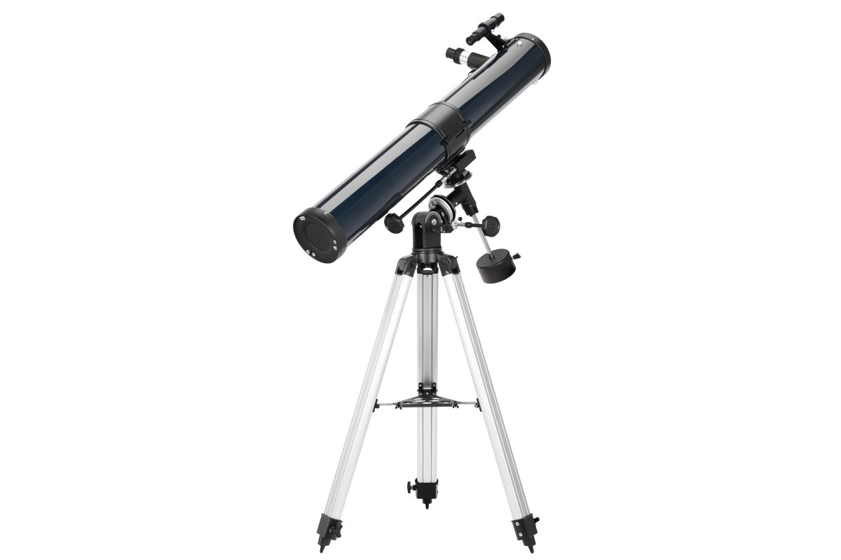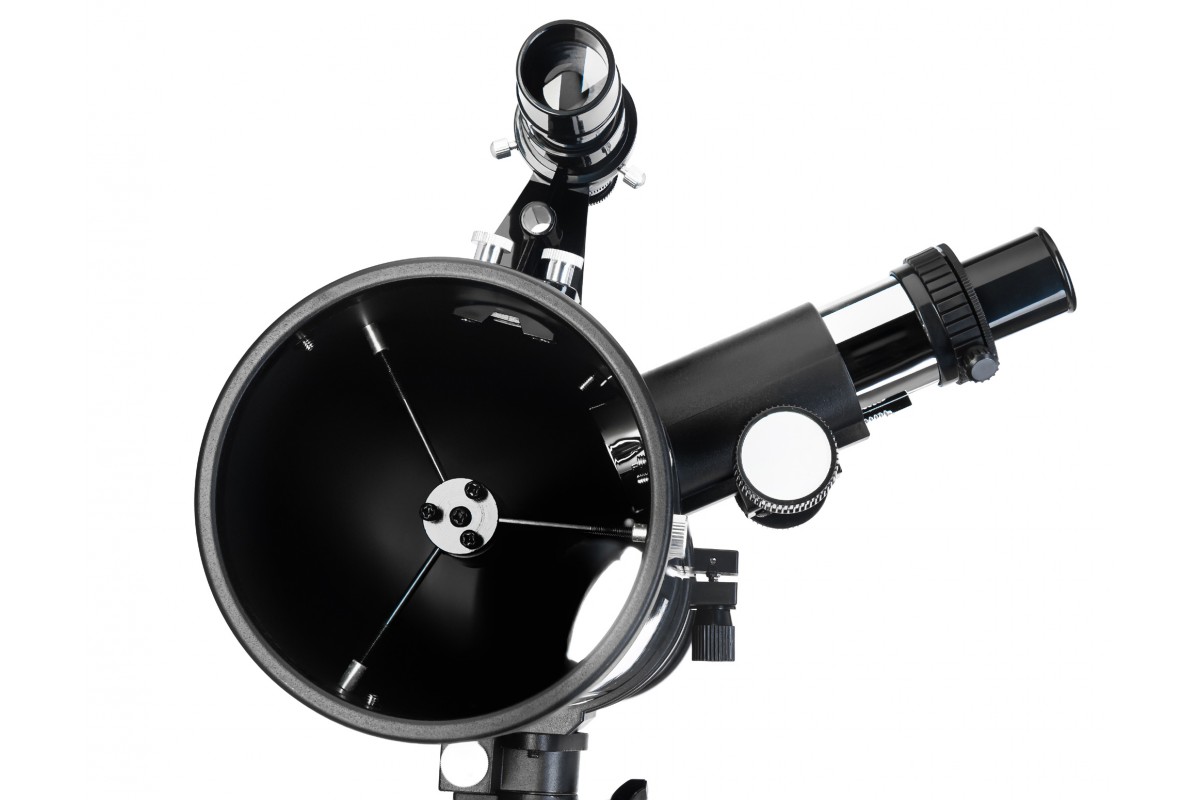 Прибор комплектуется устойчивой алюминиевой треногой с регулировкой высоты ножек. В центре треноги имеется лоток для аксессуаров, на котором можно разместить окуляры, линзу Барлоу и другие аксессуары. Все необходимое для быстрого старта наблюдений уже включено в комплект. Еще одно преимущество модели – яркая упаковочная коробка. Это готовый подарок для человека, увлеченного космосом.