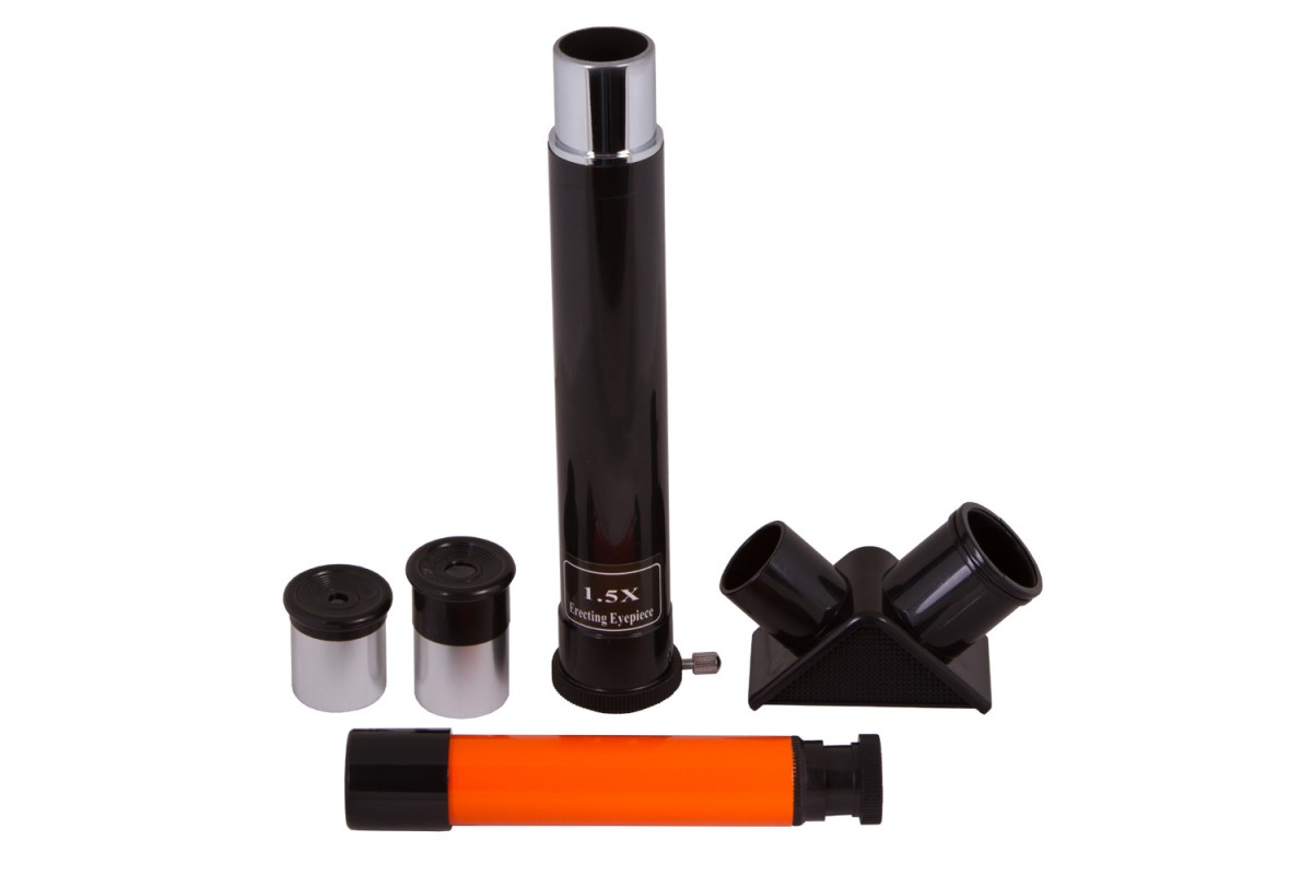 В комплект поставки включено множество аксессуаров, которые без дополнительных трат позволяют быстро начать исследование космоса. Два окуляра разной кратности дают возможность правильно подбирать увеличение для изучения разных астрономических объектов. Диагональное зеркало и оборачивающий окуляр правильно ориентируют изображение, превращая телескоп в аналог мощной зрительной трубы. С их помощью наблюдение за наземными объектами станет более комфортным.