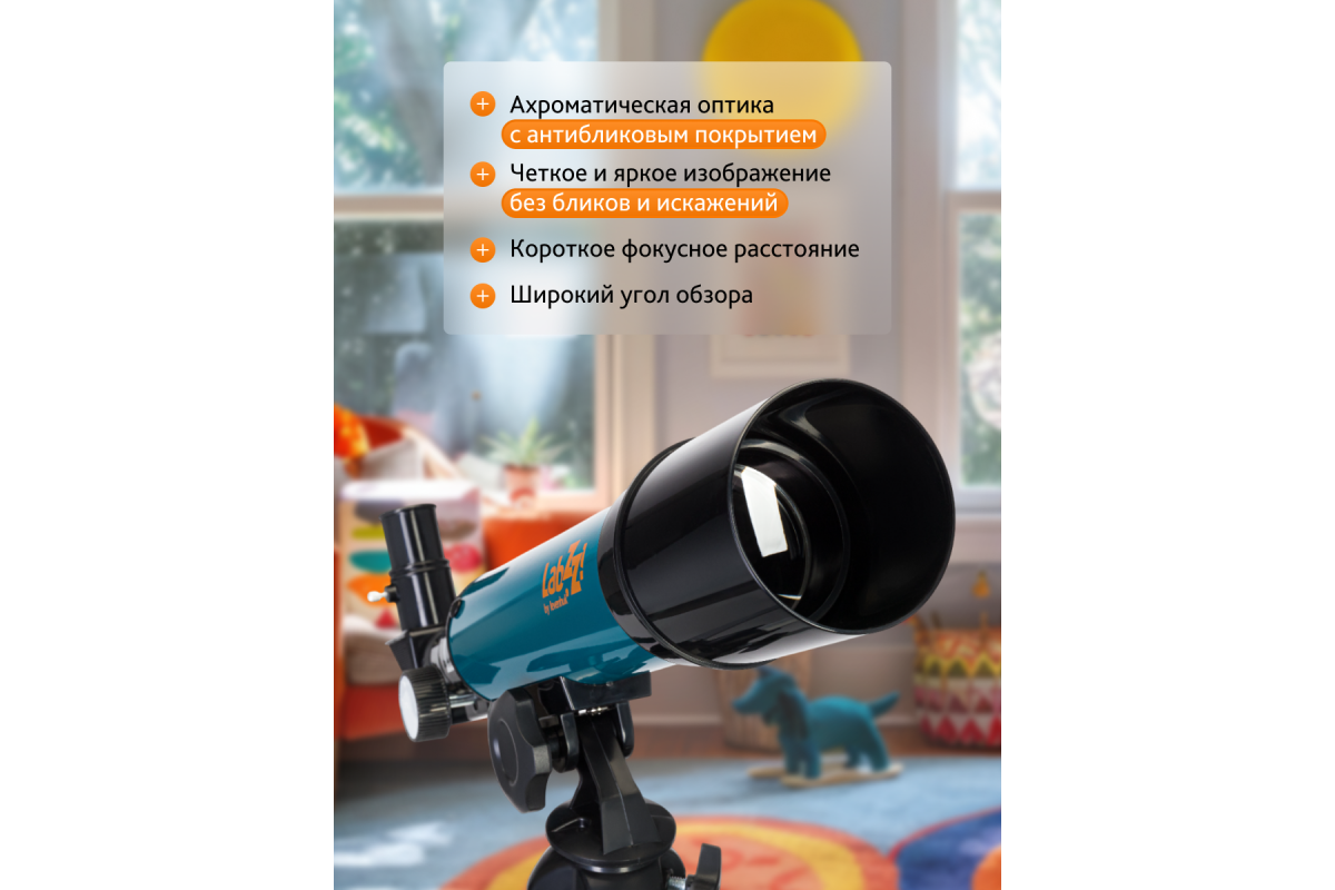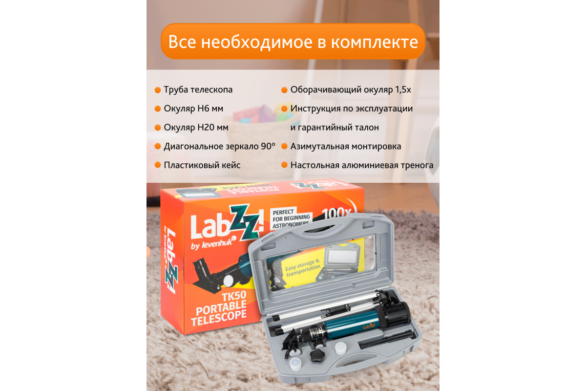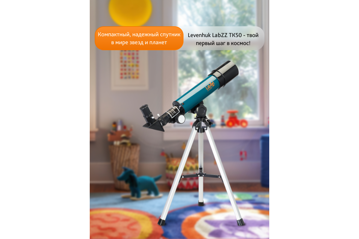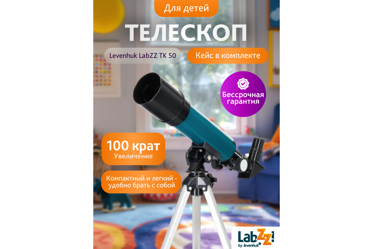 Телескоп Levenhuk LabZZ TK50 – это детская модель ахроматического рефрактора, которая позволяет наблюдать Луну и наземные объекты. Яркие звезды и некоторые планеты Солнечной системы тоже можно увидеть, но только в идеальных условиях и без какой-либо детализации. В основном это телескоп для лунных наблюдений, который обеспечивает хороший обзор и достойное разрешение картинки.