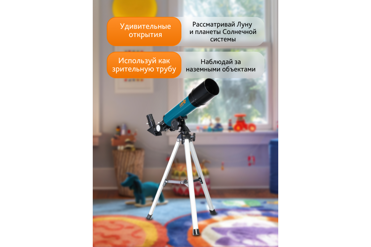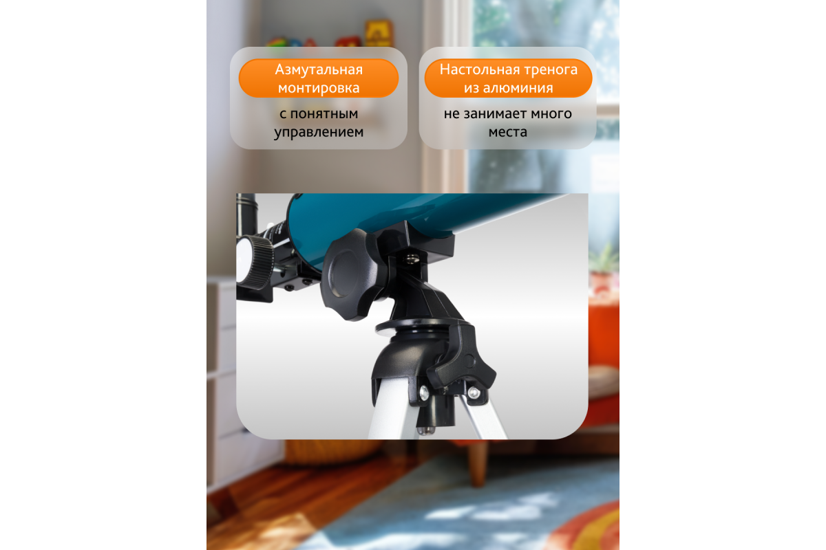 Основное преимущество этого телескопа перед многими другими детскими моделями – ультракомпактность. Он представляет собой короткофокусную, а значит, и небольшую по размерам оптическую трубу, установленную на настольную, а не полноразмерную треногу. С этим телескопом удобно путешествовать, и дома, будучи собранным, он тоже не займет места. Освоить управление телескопом совсем нетрудно – тут все как в обычной зрительной трубе. Его можно поворачивать вверх, вниз, влево и вправо.