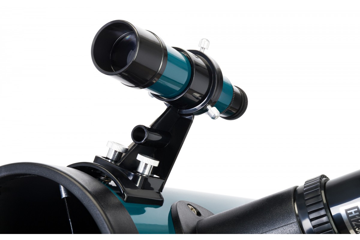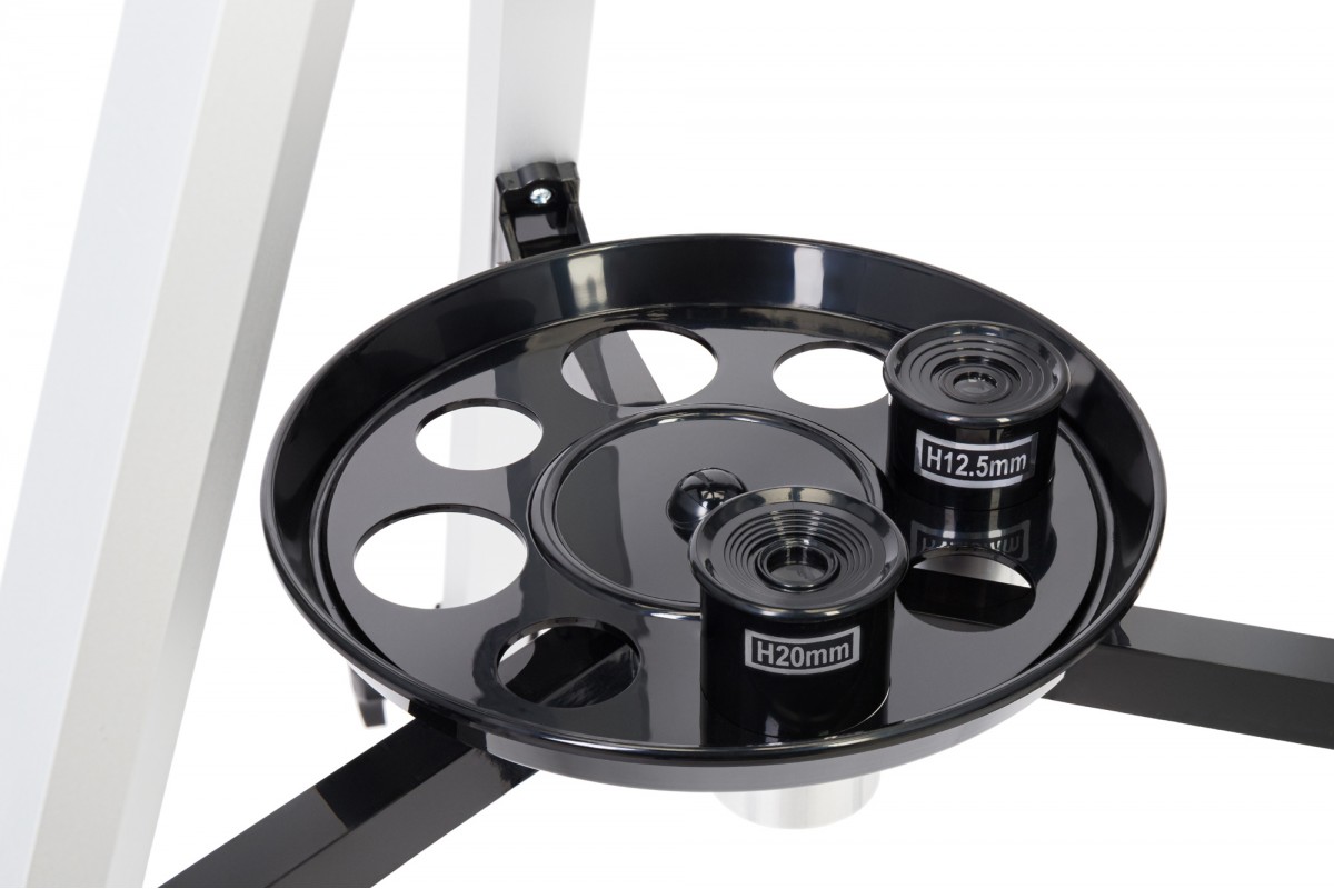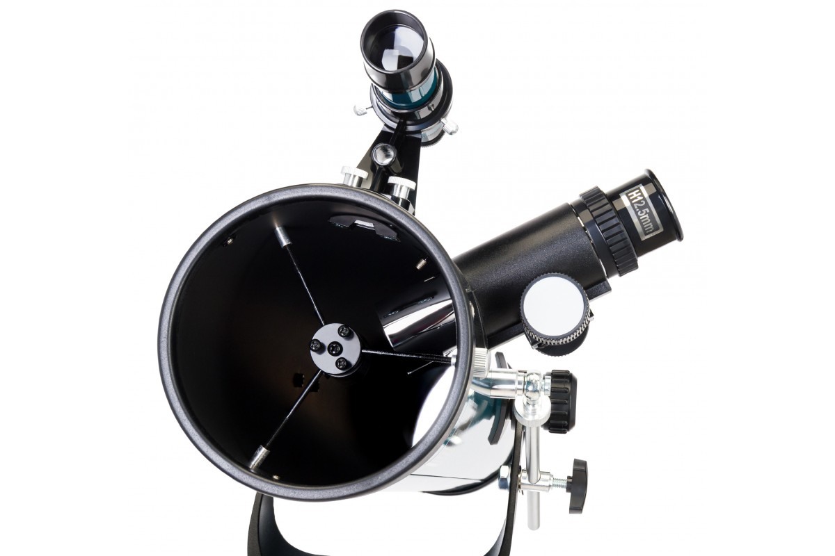 Телескоп собран по схеме ньютоновского рефлектора, все элементы сделаны из стекла и дополнены антибликовым покрытием. Оптика создает четкое изображение, собирает достаточно света для основных астрономических наблюдений, нивелирует аберрации. Азимутальная монтировка имеет микровинт на вертикальной оси, который позволяет добиться максимально плавного и точного наведения на выбранный объект. Алюминиевая тренога устойчивая и надежная. В центре находится полочка для аксессуаров. Высоту ножек треноги можно регулировать.