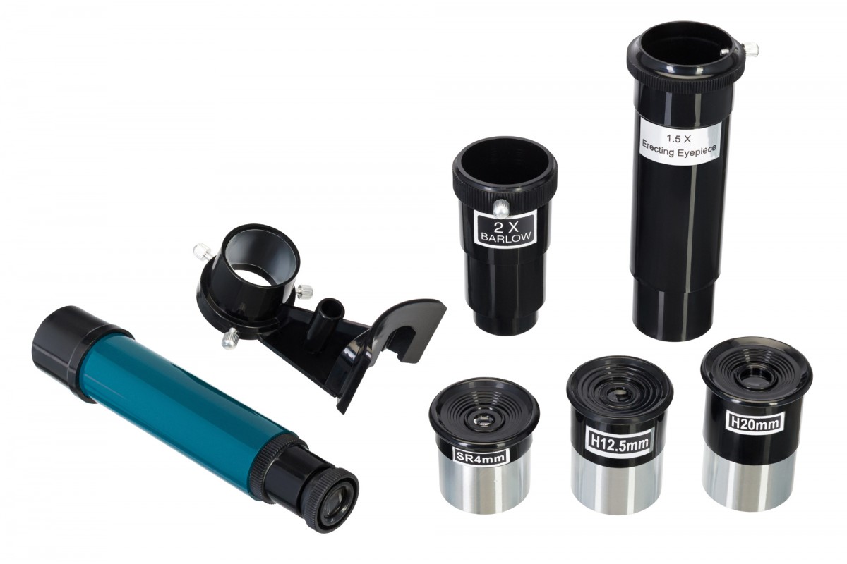 Комплект аксессуаров включает все необходимое, поэтому приобретать что-либо дополнительно не нужно. Телескоп и принадлежности помещены в прочный пластиковый кейс с ручкой, который можно использовать для безопасной перевозки прибора, например, на дачу.