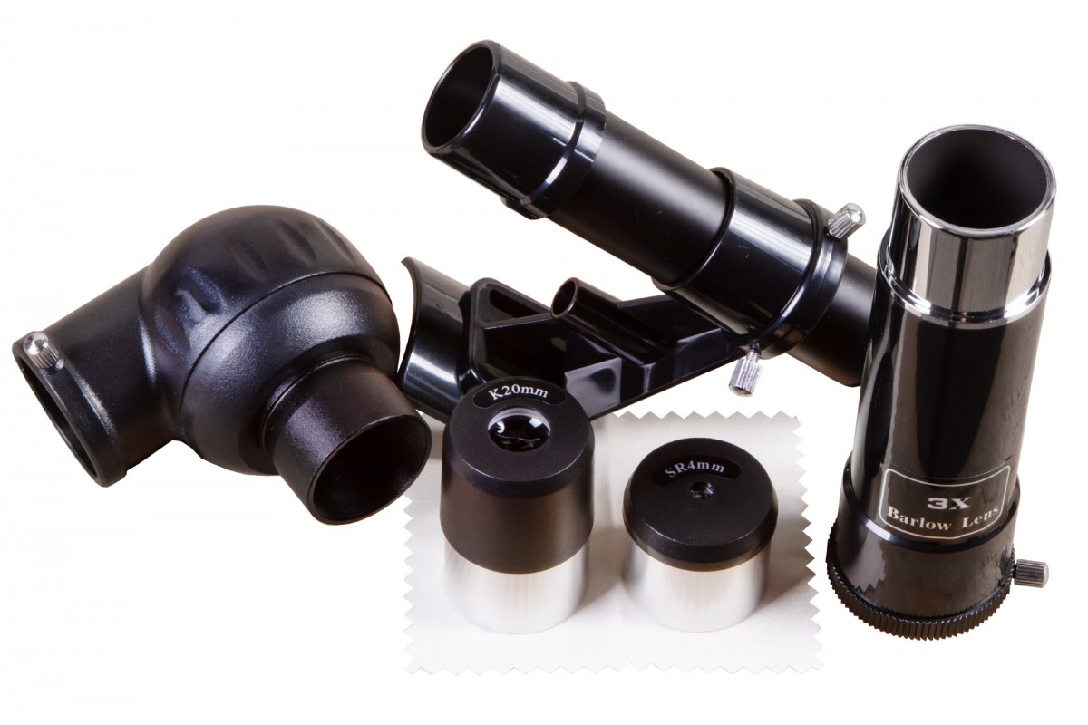 В комплект поставки включены короткофокусный и длиннофокусный окуляры и диагональная призма. Меняя окуляры, можно добиться разного увеличения. На большой кратности удобно изучать крупные объекты – так можно увидеть больше деталей, а малое увеличение позволяет охватить одним взглядом протяженную область. Диагональная призма незаменима при наземных наблюдениях. Оно исправляет свойственную телескопам перевернутость картинки – возвращает верх и низ изображения на свои места.