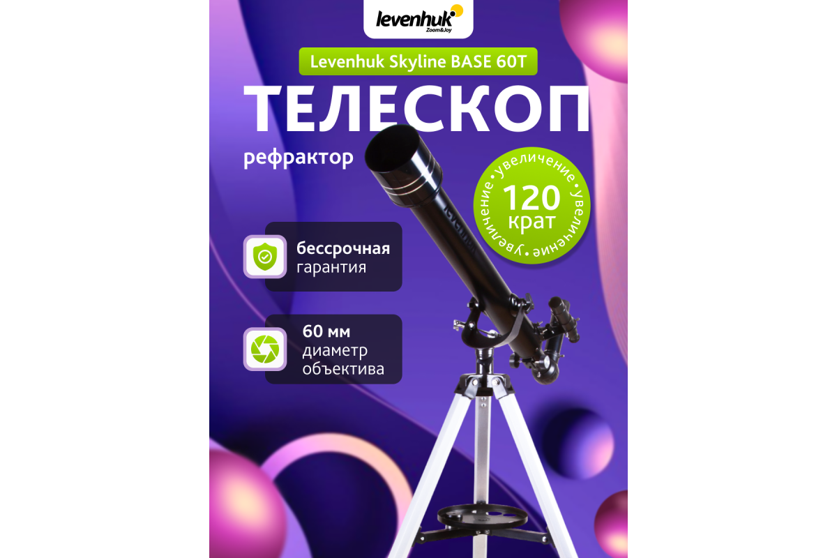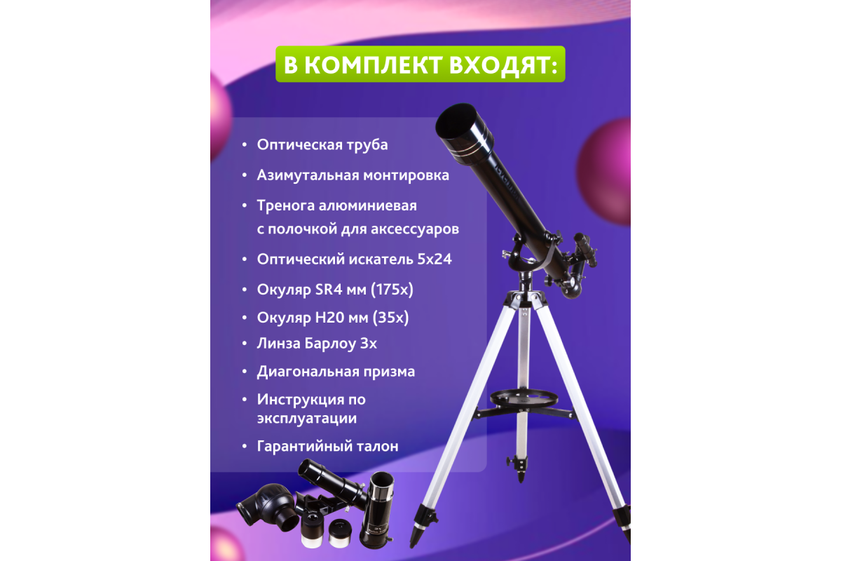 Levenhuk Skyline BASE 60T – рефрактор для начинающих астрономов, отличающийся простым управлением и хорошей оптикой. В него можно увидеть кратеры на Луне, фазы Венеры, яркие галактики и двойные звезды. Телескоп отлично подходит для наземных наблюдений и изучения планет Солнечной системы, объекты дальнего космоса он показывает без деталей. В комплект поставки включены основные оптические аксессуары, поэтому Levenhuk Skyline BASE 60T – отличный выбор для подарка. Все, что нужно для наблюдений, любитель астрономии найдет в коробке с телескопом.