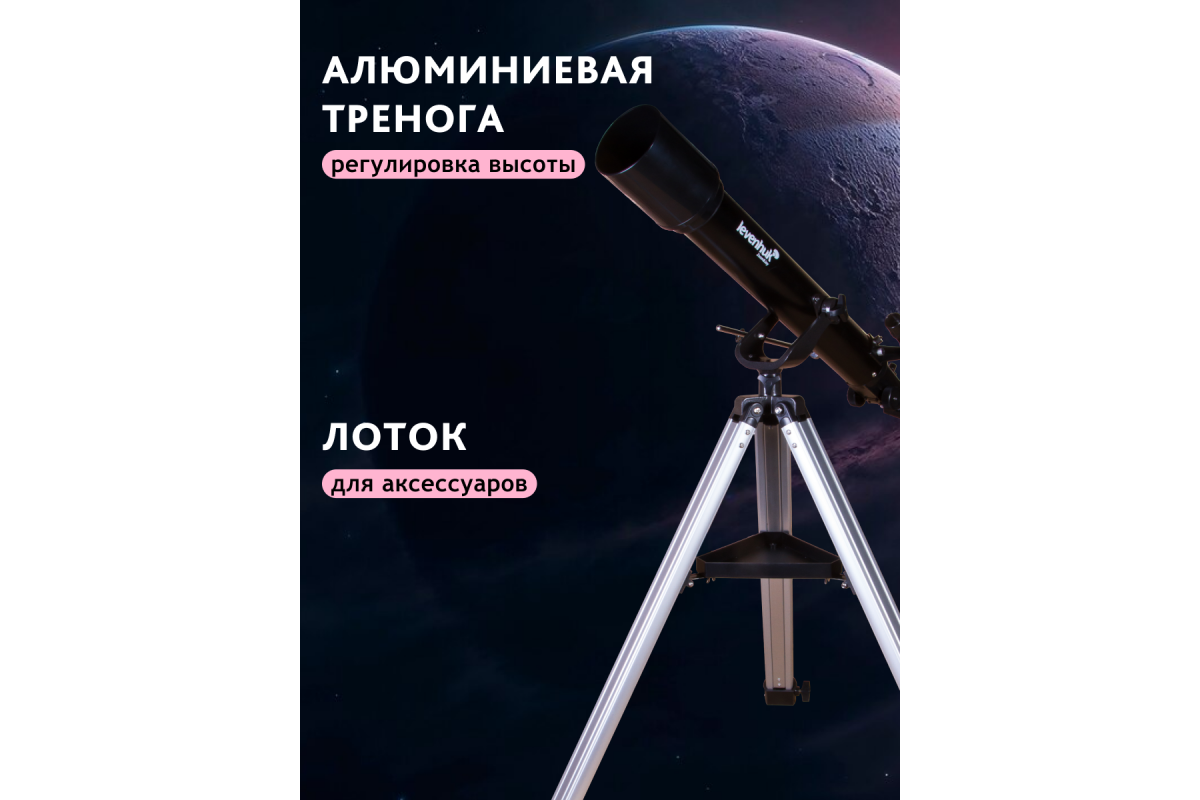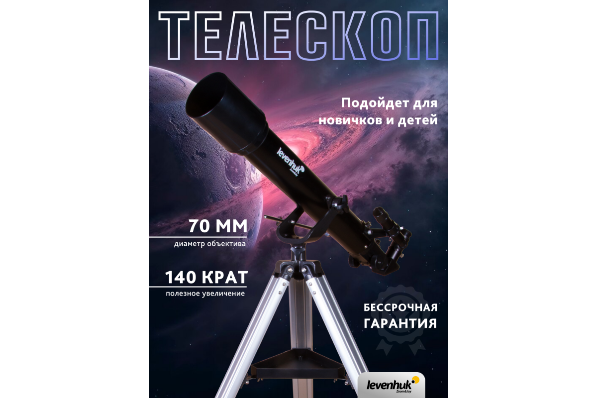Levenhuk Skyline BASE 70T – рефрактор, в который начинающий любитель астрономии сможет наблюдать Луну, планеты Солнечной системы и отдельные объекты дальнего космоса. Благодаря тому, что в комплект поставки включено диагональное зеркало, телескоп можно использовать и в качестве зрительной трубы – для изучения наземных объектов. Стоит отметить, что этот телескоп комплектуется исчерпывающим набором оптических аксессуаров, которые раскрывают все его возможности, и нет необходимости приобретать дополнительные. Levenhuk Skyline BASE 70T – это прекрасный подарок для себя или близких людей.
