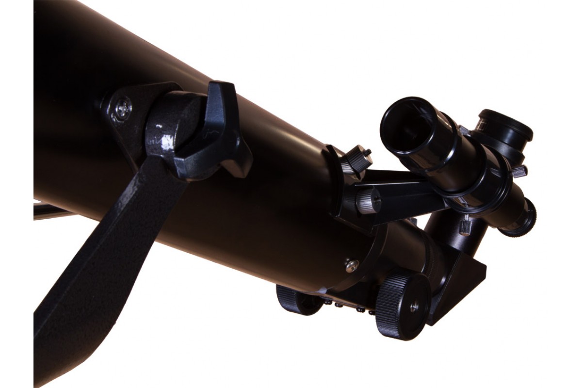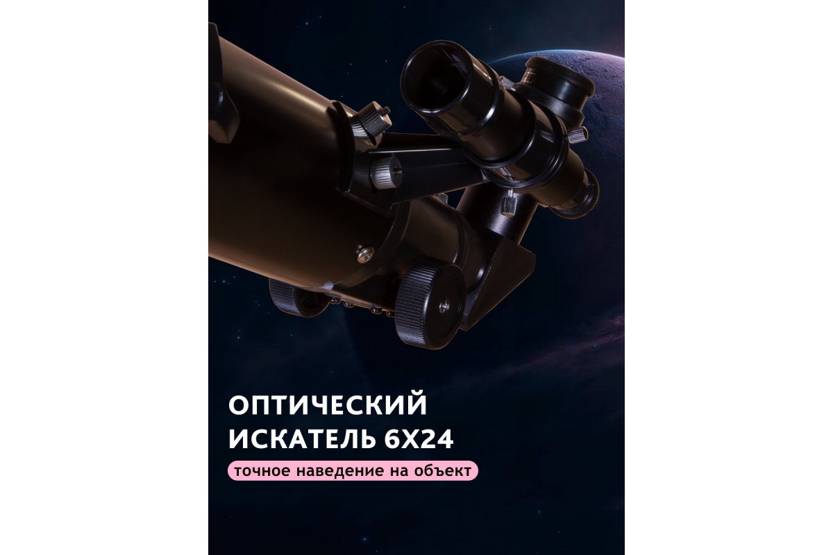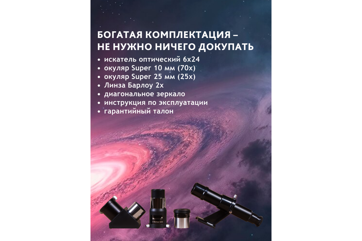 Все линзы телескопа сделаны из стекла и защищены слоем просветляющего покрытия. Оптика передает четкую, яркую и детализированную картинку, позволяет подробно изучать астрономические объекты на предельных увеличениях. Чтобы навести телескоп на интересующий вас участок неба, необходимо просто повернуть оптическую трубу в нужную сторону. Благодаря азимутальной монтировке процесс наведения телескопа не сложнее управления зрительной трубой. Дополнительную помощь при наведении оказывает оптический искатель с 6-кратным увеличением.