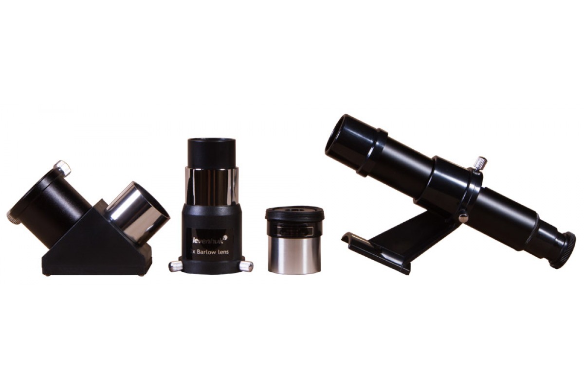 В комплект поставки включено множество оптических аксессуаров: два окуляра, линза Барлоу, диагональное зеркало. Комбинируя их, можно добиться оптимального увеличения для наблюдения самых разных объектов. Есть в комплекте и алюминиевая тренога. Она устойчивая, надежная, ее можно устанавливать даже на неровных поверхностях. Высота ножек треноги регулируется, есть лоток для аксессуаров.