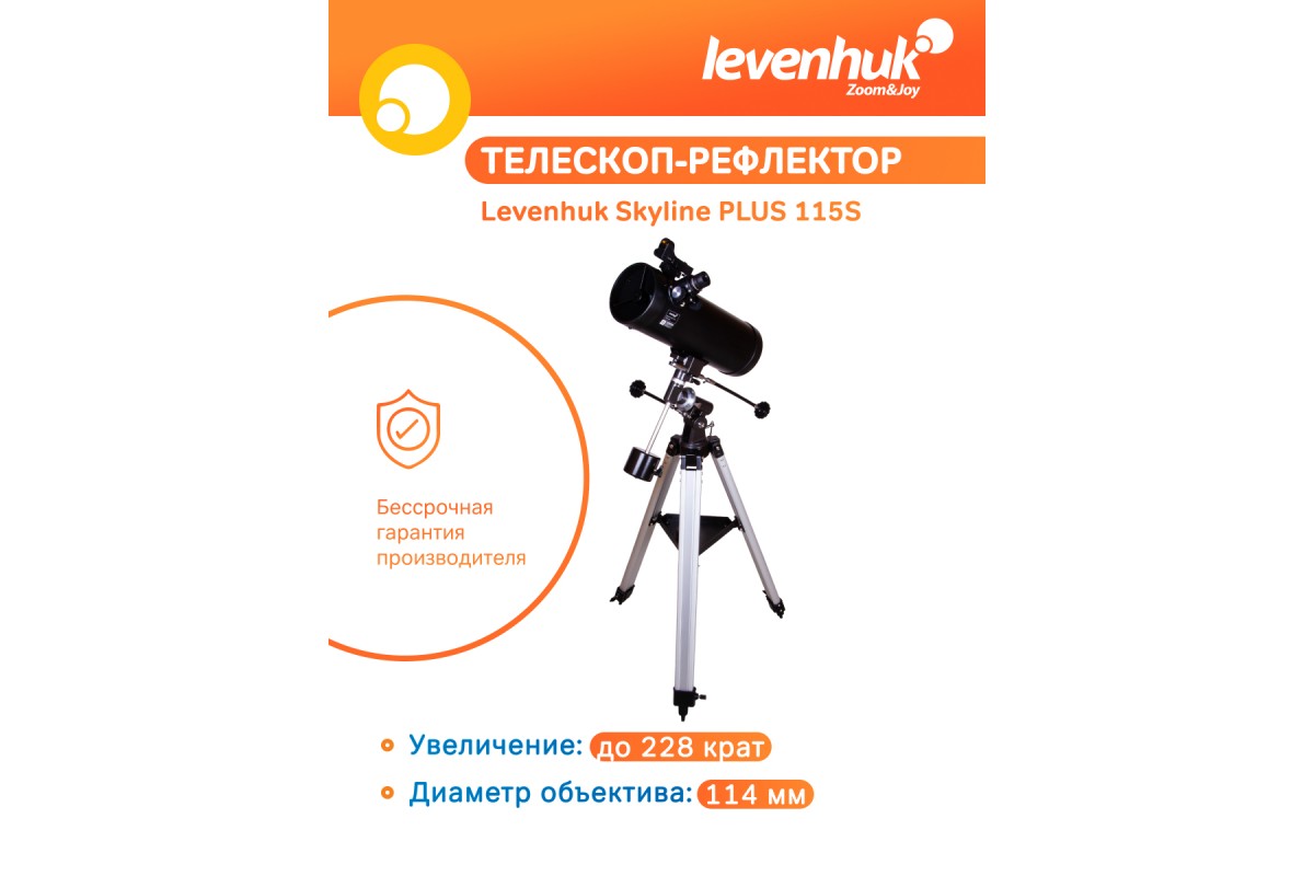 Levenhuk Skyline PLUS 115S – короткофокусный рефлектор Ньютона, который создан для наблюдений за галактиками, туманностями, звездными скоплениями и другими объектами дальнего космоса. Он достаточно небольшой, собирает много света и хорошо работает даже по тусклым звездам. Этот телескоп станет отличным выбором для начинающего астронома, который хочется сосредоточиться на исследовании удаленных уголков Вселенной.