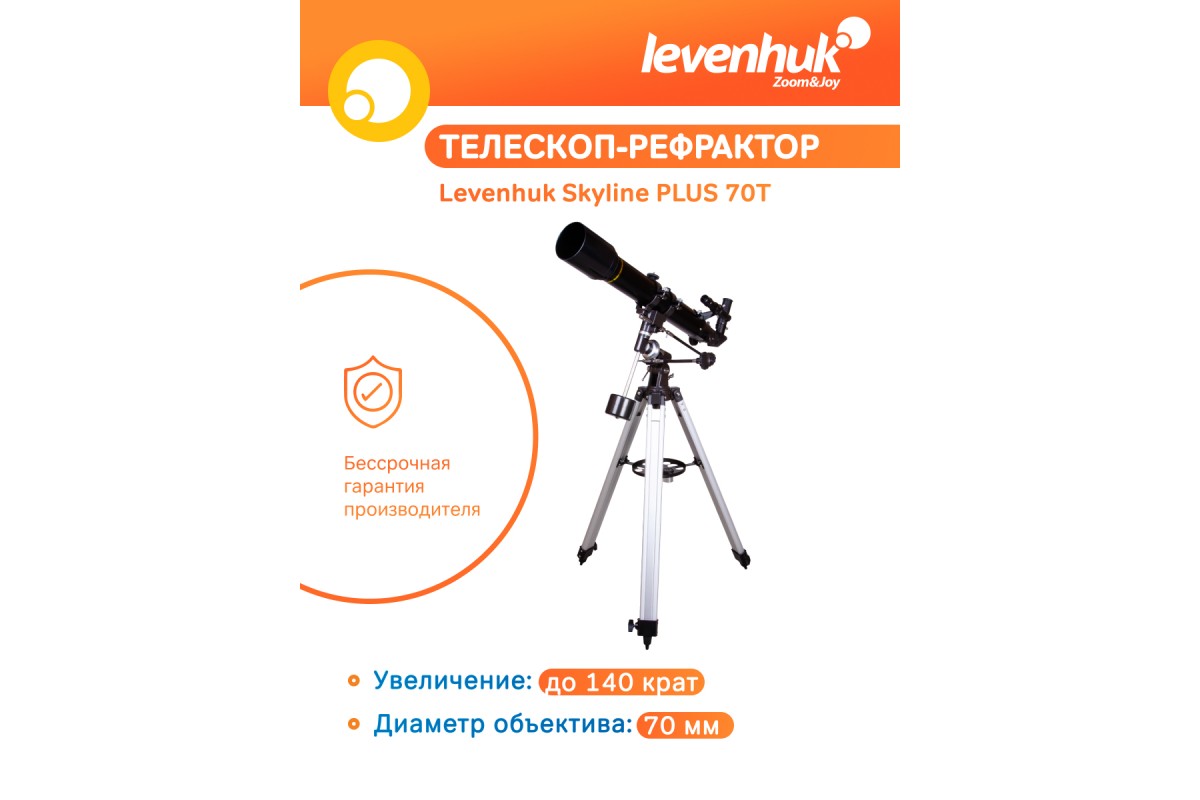 Рефрактор Levenhuk Skyline PLUS 70T – это хороший вариант телескопа для начальных астронаблюдений. Во-первых, он передает четкое и детальное изображение Луны и планет Солнечной системы, во-вторых, может использоваться для наземных наблюдений. И, в-третьих, комплектуется исчерпывающим набором аксессуаров. С этим телескопом легко и приятно знакомиться с миром астрономии, осваивать азы управления оптической техникой, расширять свои познания о космосе.