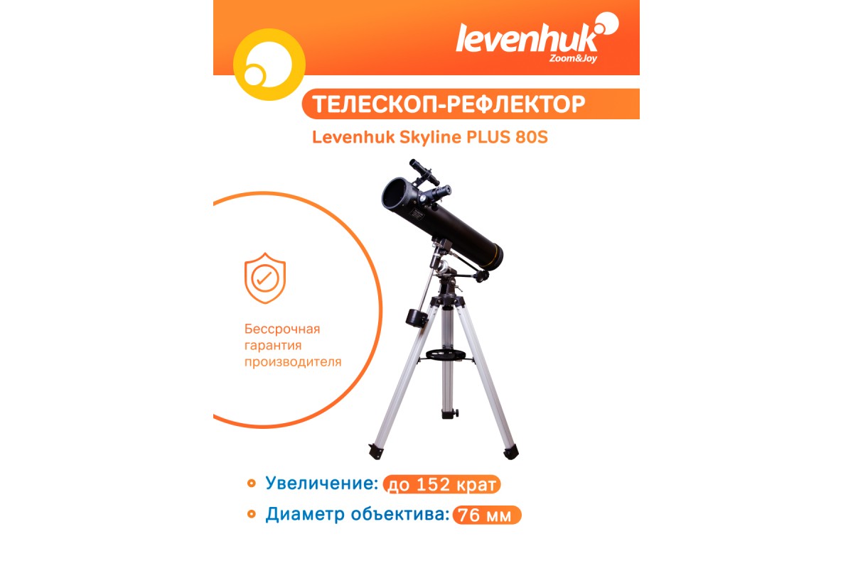 Levenhuk Skyline PLUS 80S – рефлектор Ньютона на экваториальной монтировке. В основе оптической схемы лежит сферическое зеркало, и телескоп передает четкое и контрастное изображение вплоть до предельно полезного увеличения. Рефлектор отлично подходит для изучения объектов дальнего космоса: туманностей, галактик, звездных скоплений и других. В пределах Солнечной системы хорошо видны: Луна, Марс, Меркурий, Юпитер, Венера и Сатурн. Рассмотреть Уран и Нептун можно лишь в виде небольших дисков без деталей на них.